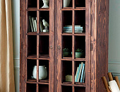 Особенности: Декоративное фрезерование на деревянных дверях, английская решетка на стеклянных фасадах, двери установлены на штыревых петлях, применяются ручки и декоративные гвозди медного цвета.