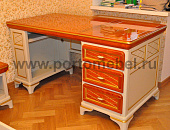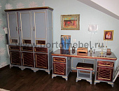 Мебель для кабинета Софи выполнена в стиле арт-деко из натурального массива березы. Формы мебельных предметов – это свойственные стилю прямые и ломаные линии, четкость и графичность декора. Цвет украшает ромбовый декор в стиле «арт-деко» и поталь, техника нанесения которой схожа с техникой отделки сусальным золотом.