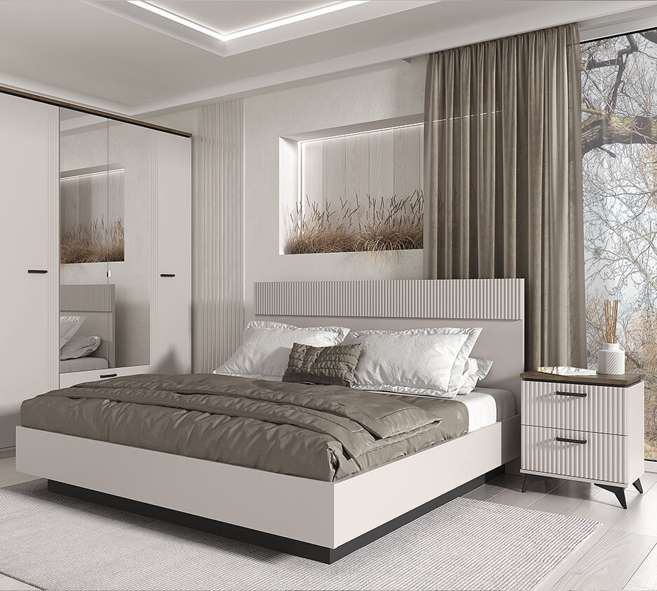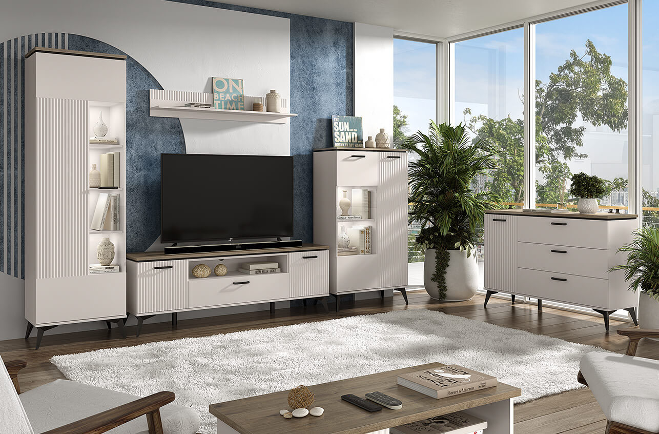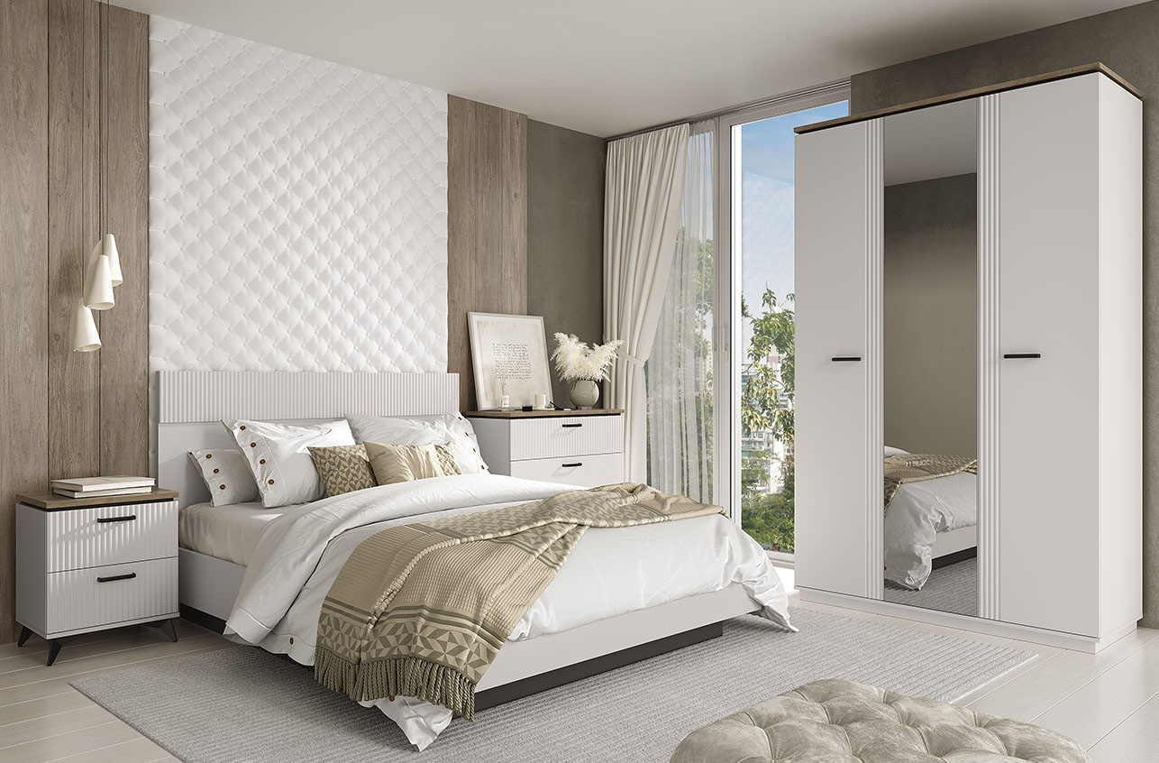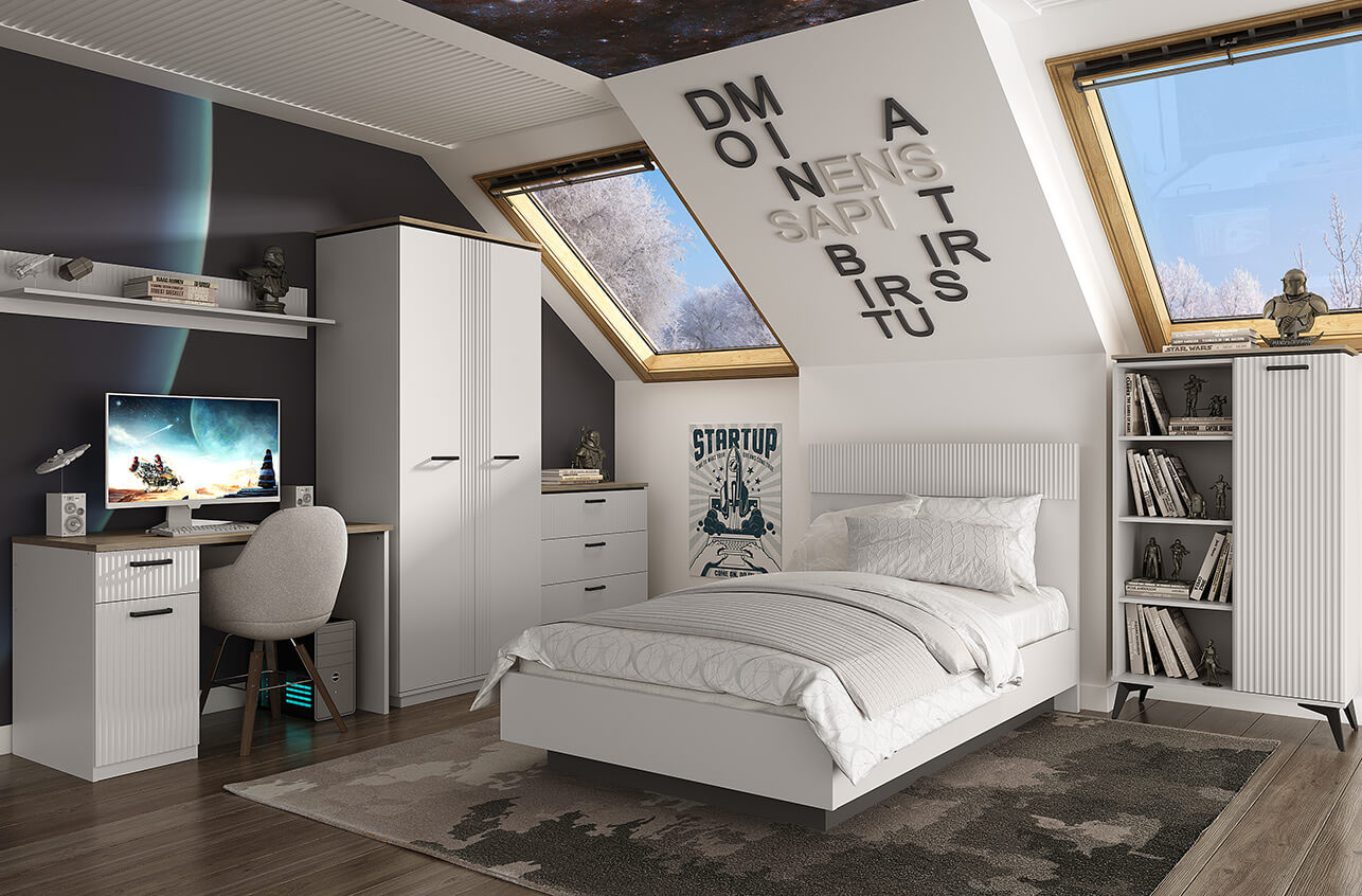 Коллекция VINATI - чистые линии, контрастные цвета (белый и цвет дерева), рифленые фасады – все это создает атмосферу легкости и элегантности. VINATI - комплект мебели для спальни, подростковой или гостиной, который превратит вашу комнату в место, где хочется расслабиться и забыть обо всех заботах. В нем гармонично сочетаются минимализм, функциональность и элегантные детали, создавая атмосферу спокойствия и уюта.