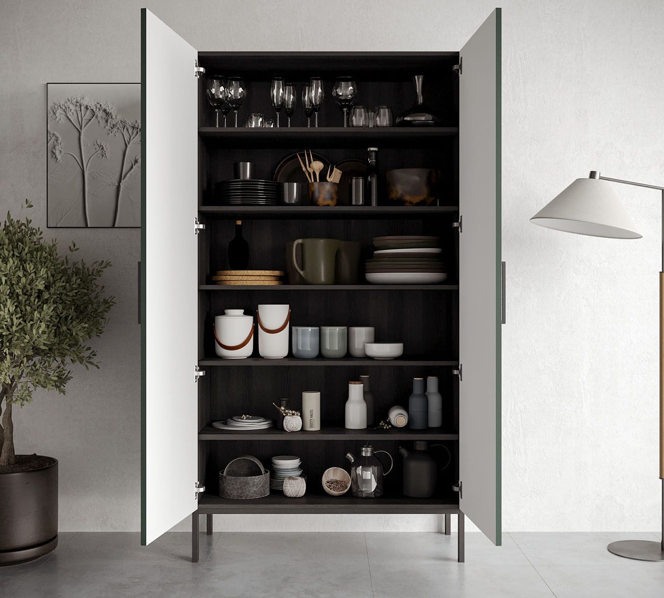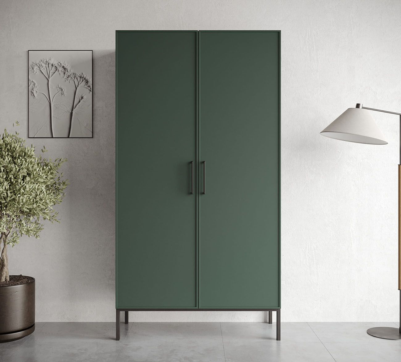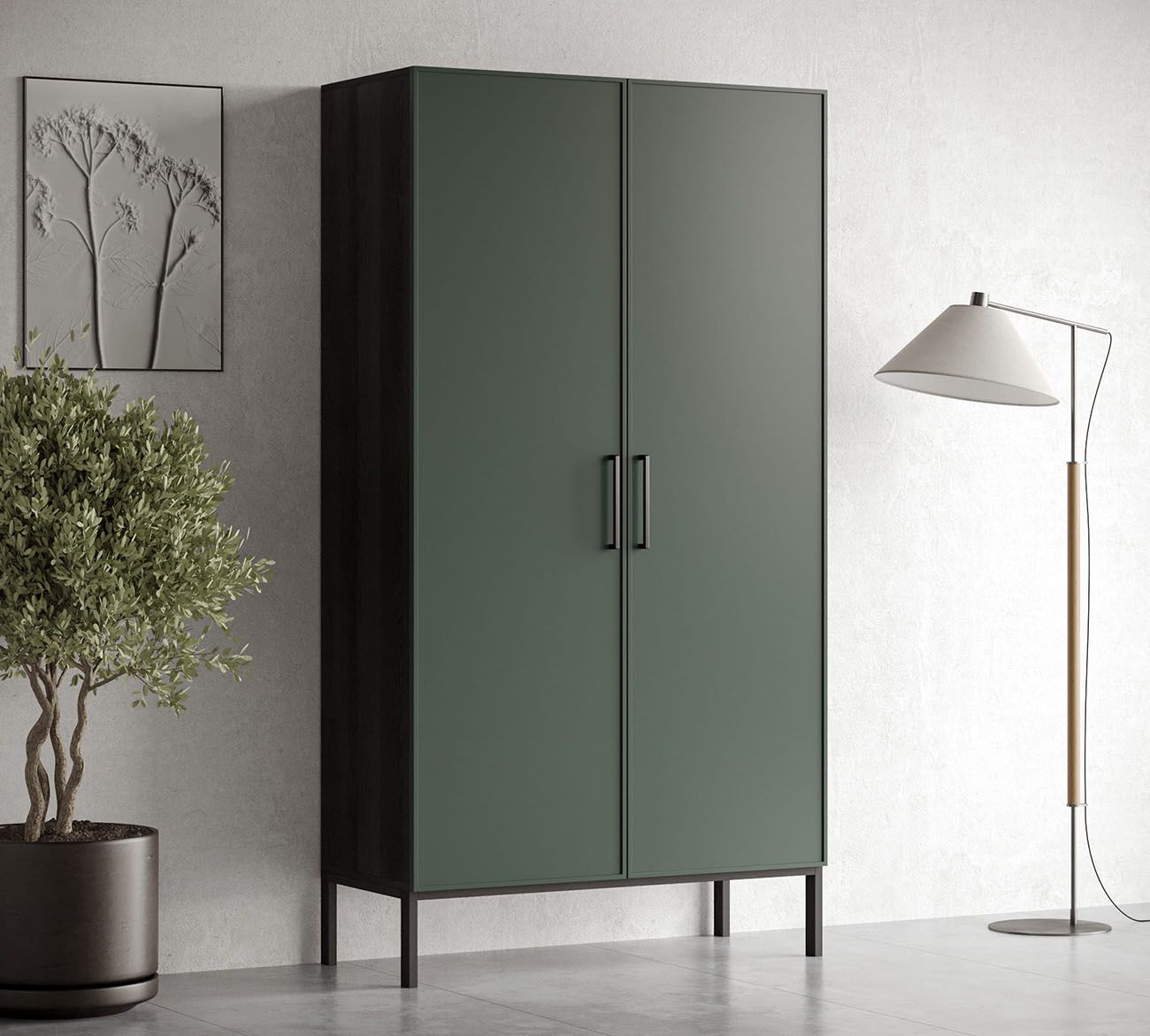Шкаф двухдверный Nicole. Корпус - дуб шерман конъяк (белый цвет фасадов)/черный (зеленый цвет фасадов), ножки - черные.