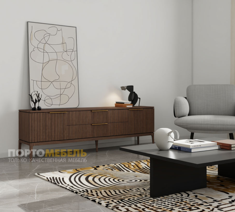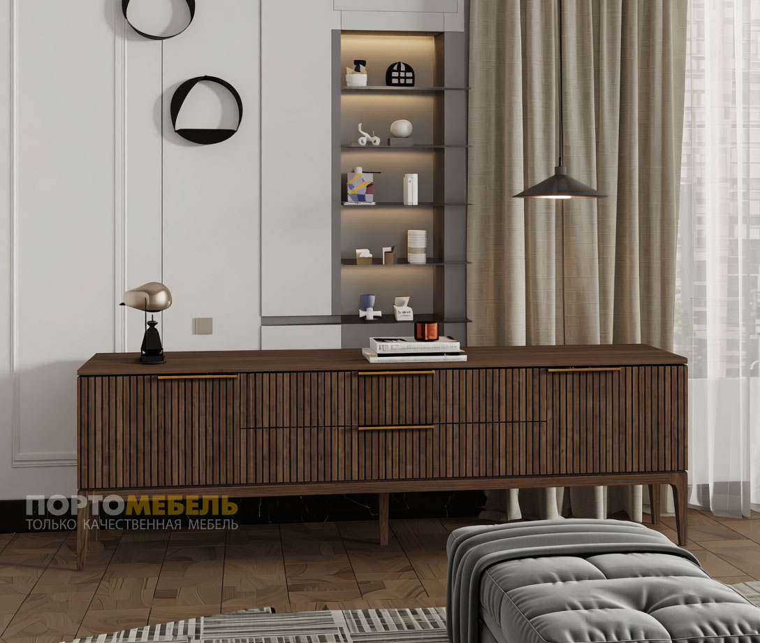 Объем: 0.45 м3Тумба ТВ с 2 ящиками и 2 распашными фасадами Bryce. Фасады с фрезеровкой, мебельная ручка - под латунь.