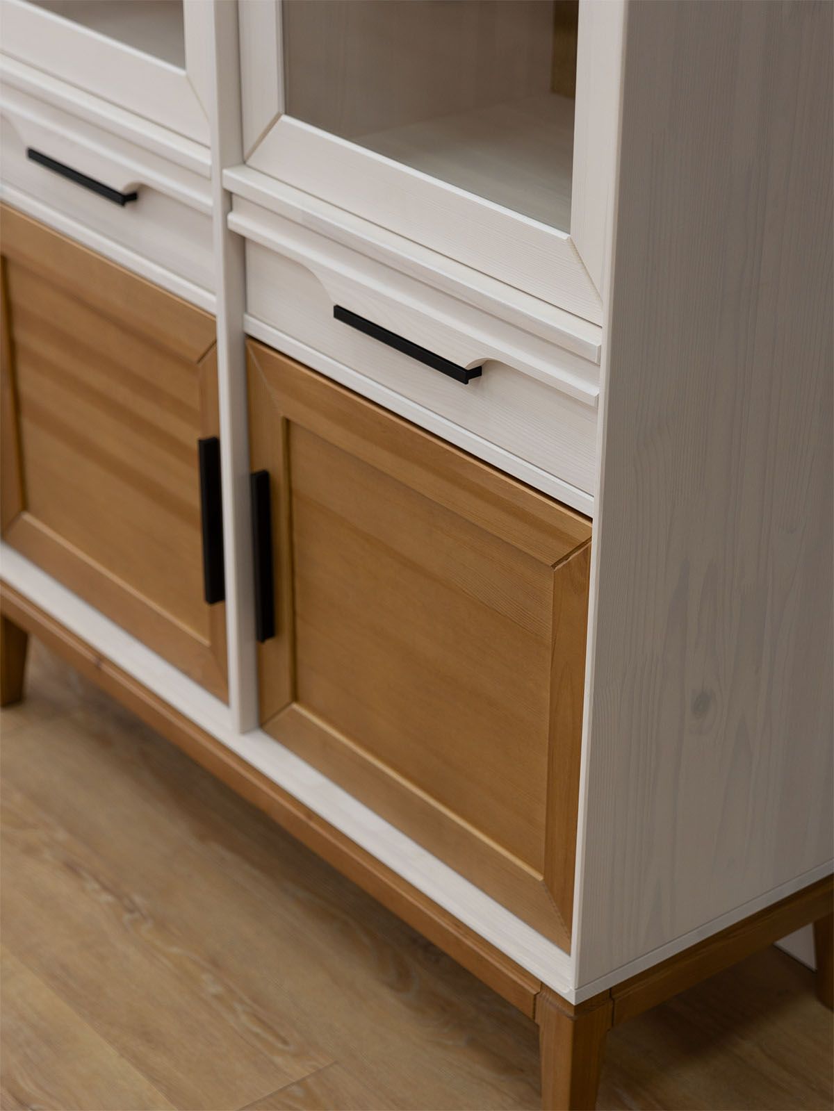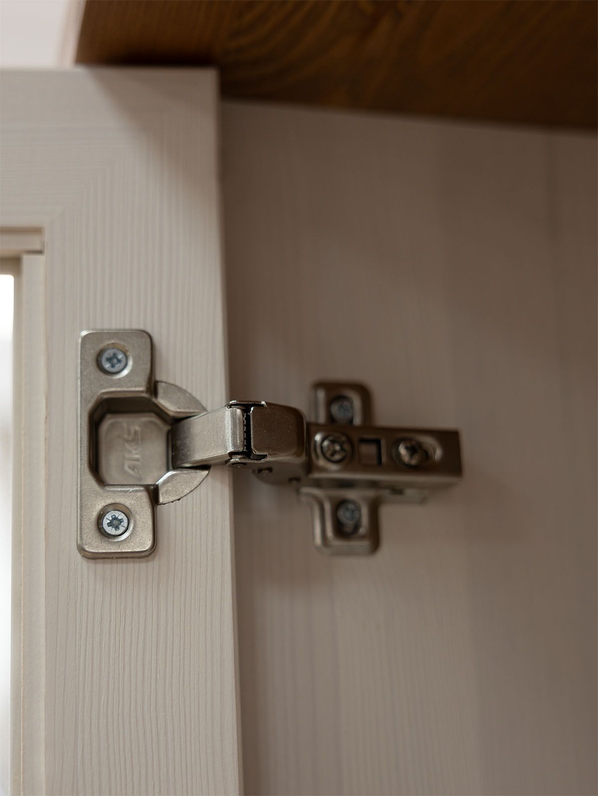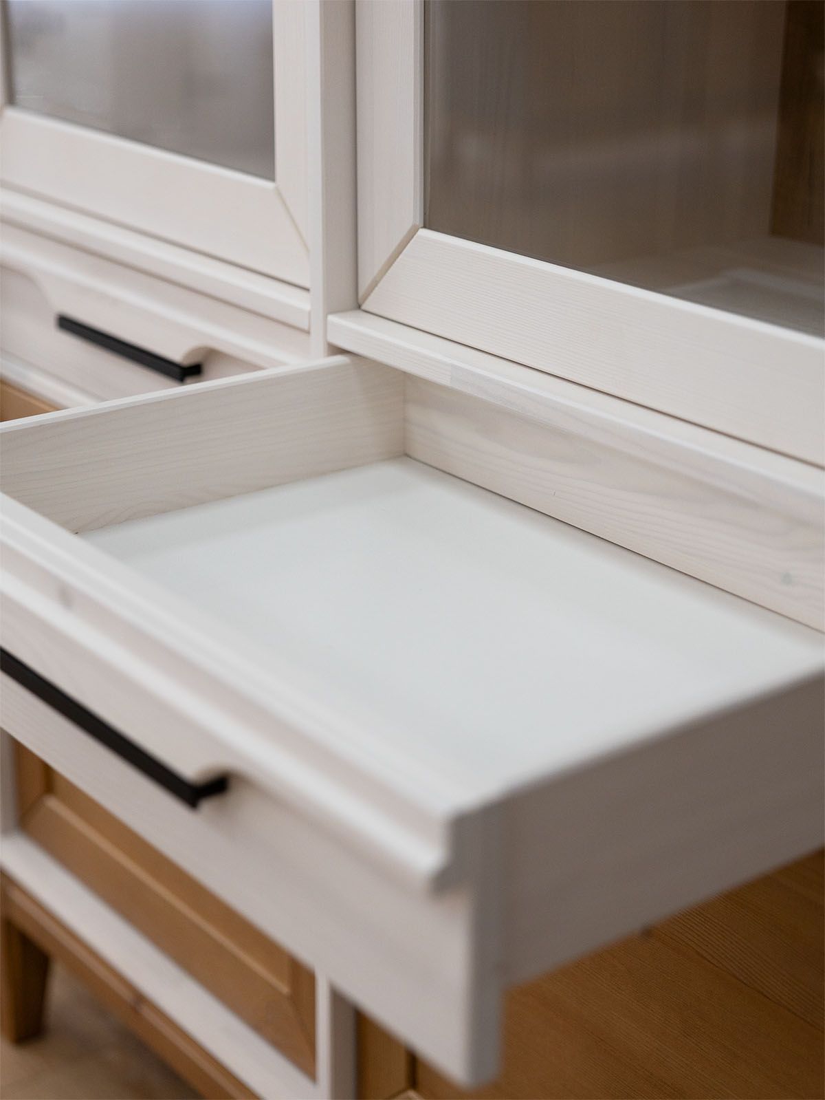 Фурнитура: Направляющие скрытого монтажа с доводчиками, петли с доводчиками. Металлические черные ручки.