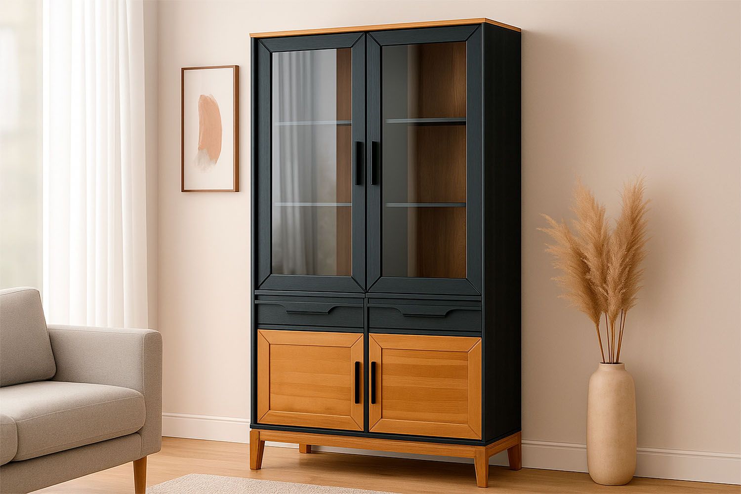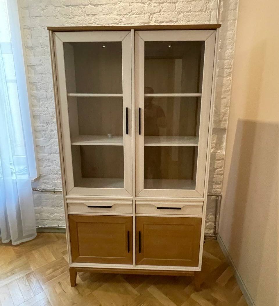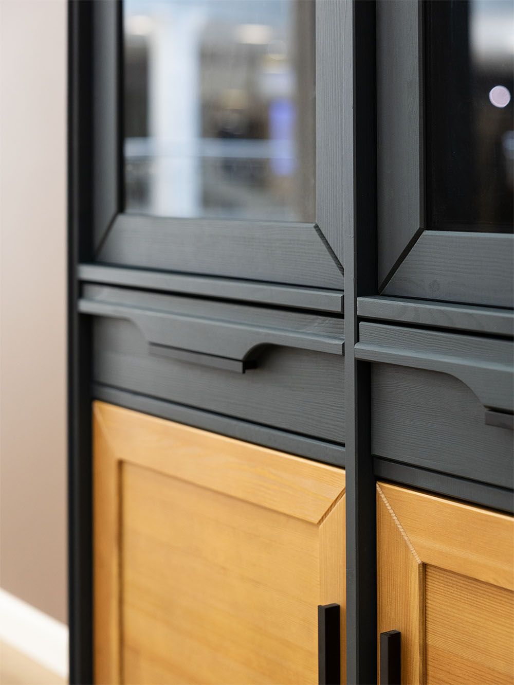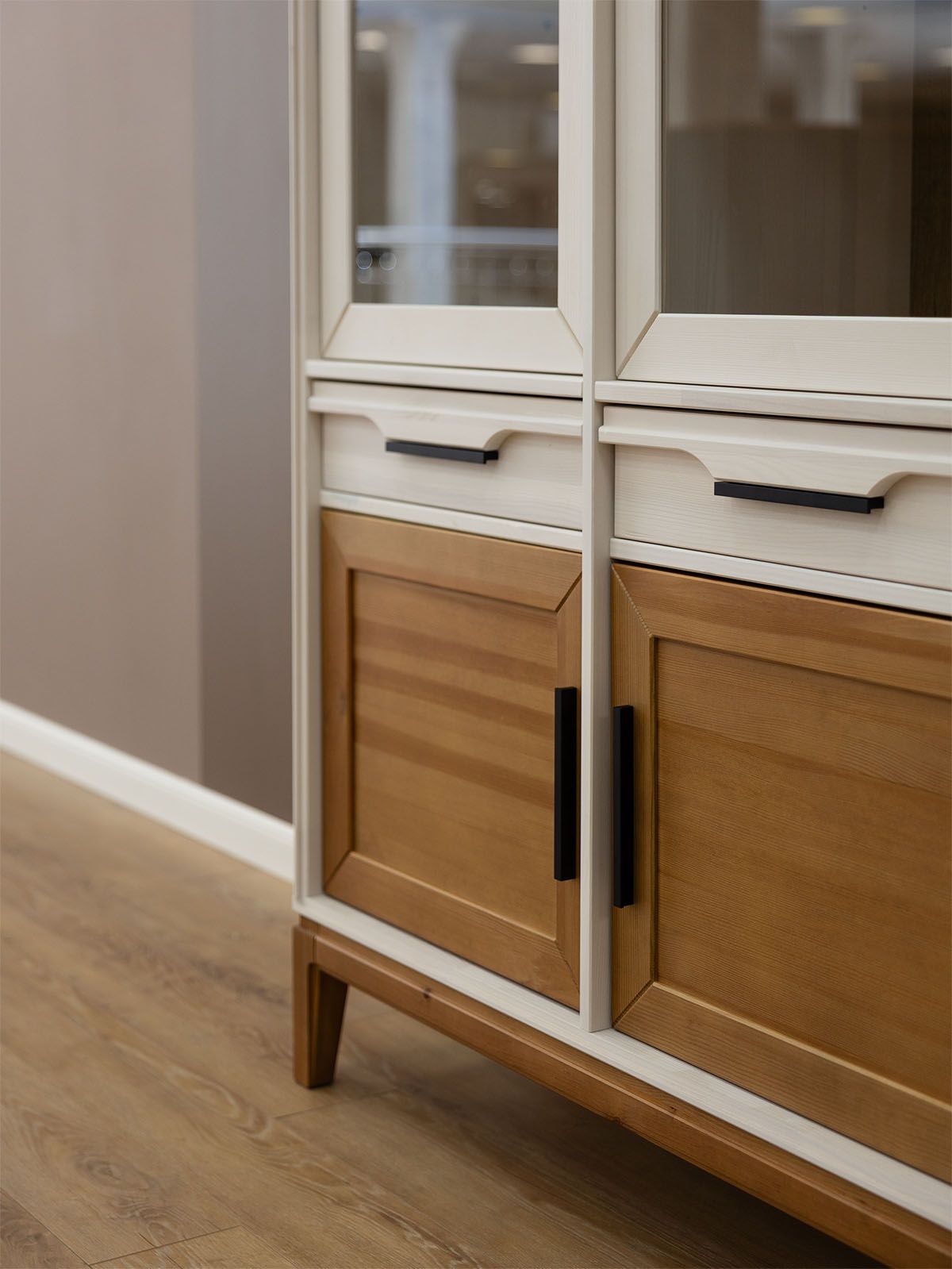 Фурнитура: Направляющие скрытого монтажа с доводчиками, петли с доводчиками. Металлические черные ручки.