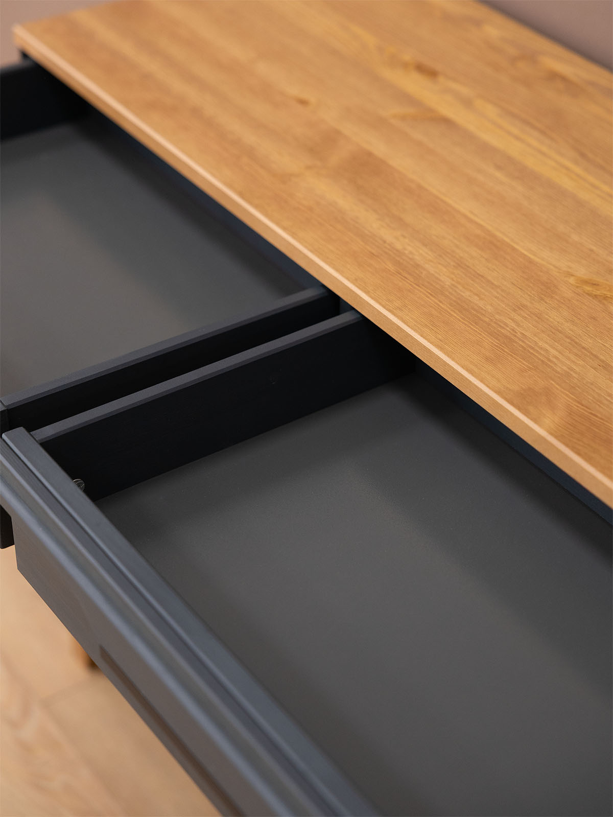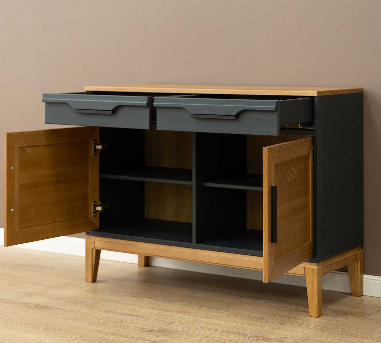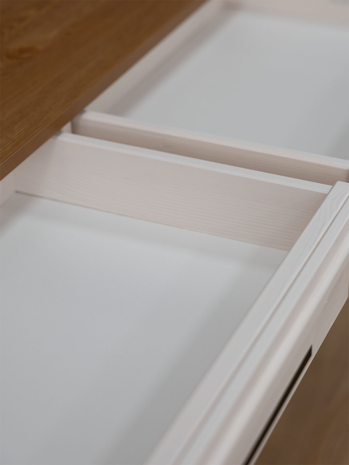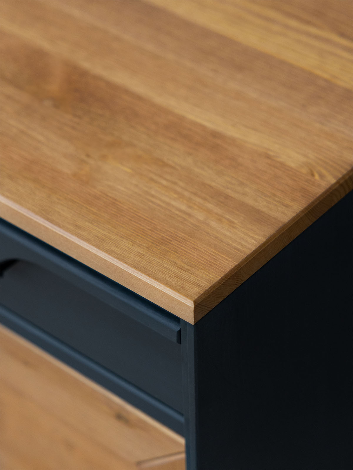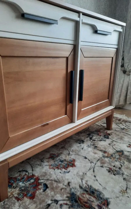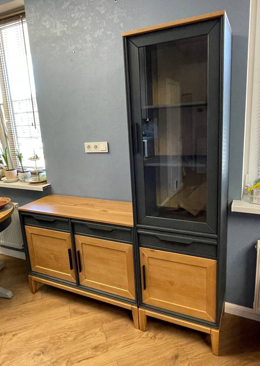 Фурнитура: Направляющие скрытого монтажа с доводчиками, петли с доводчиками. Металлические черные ручки.