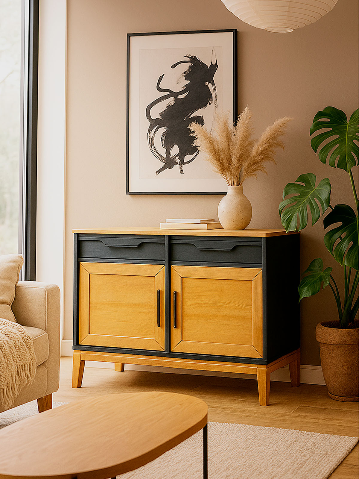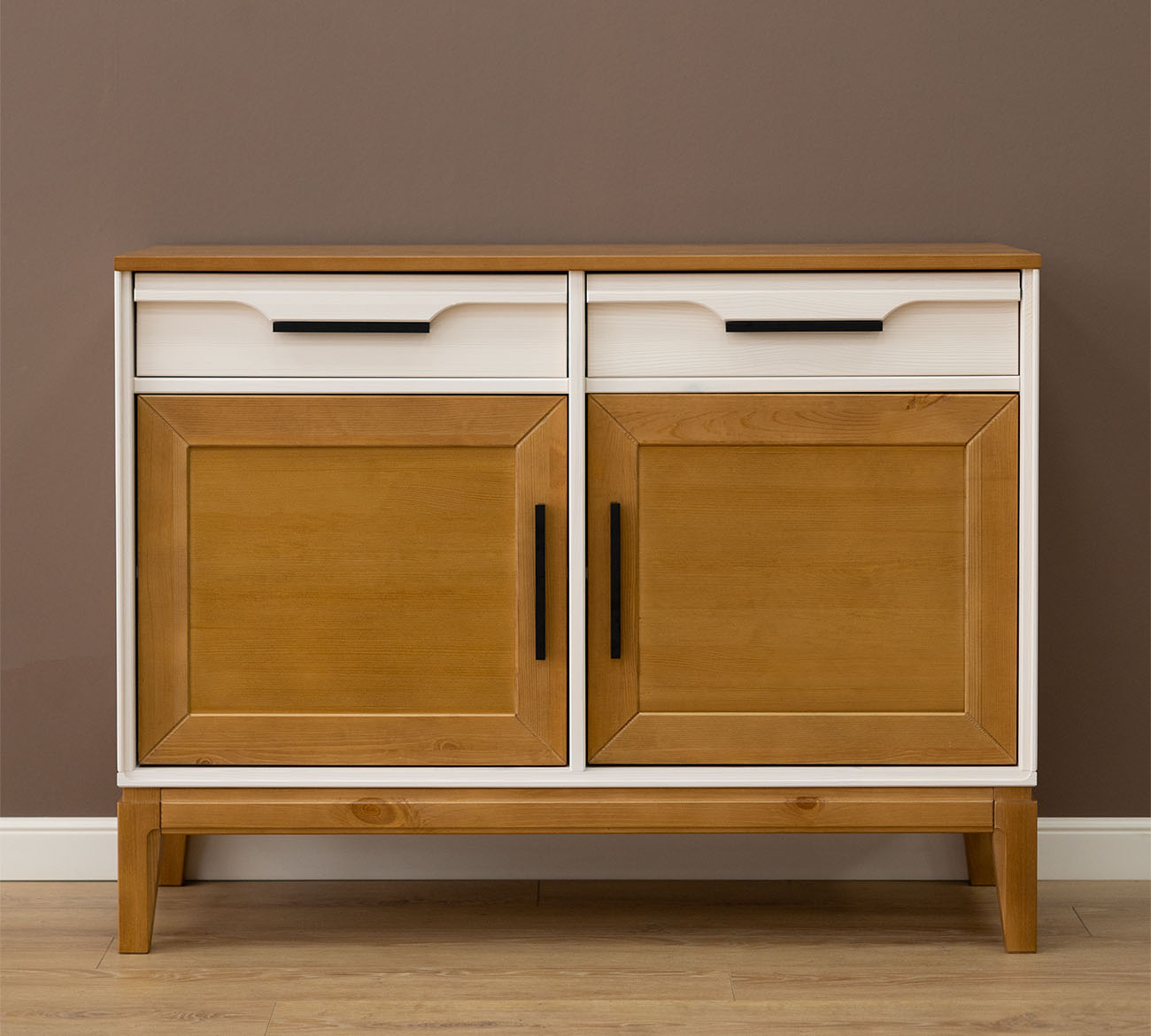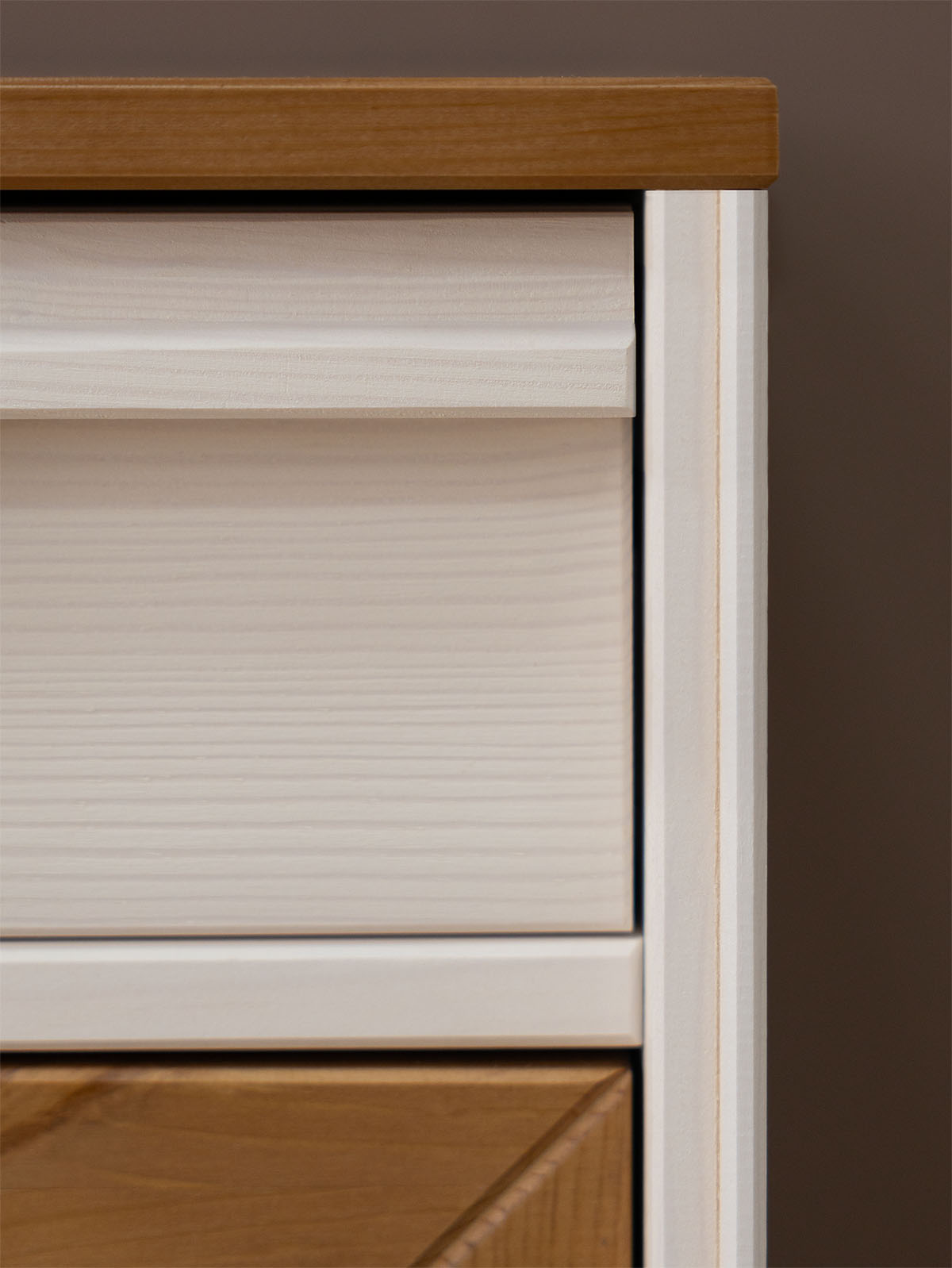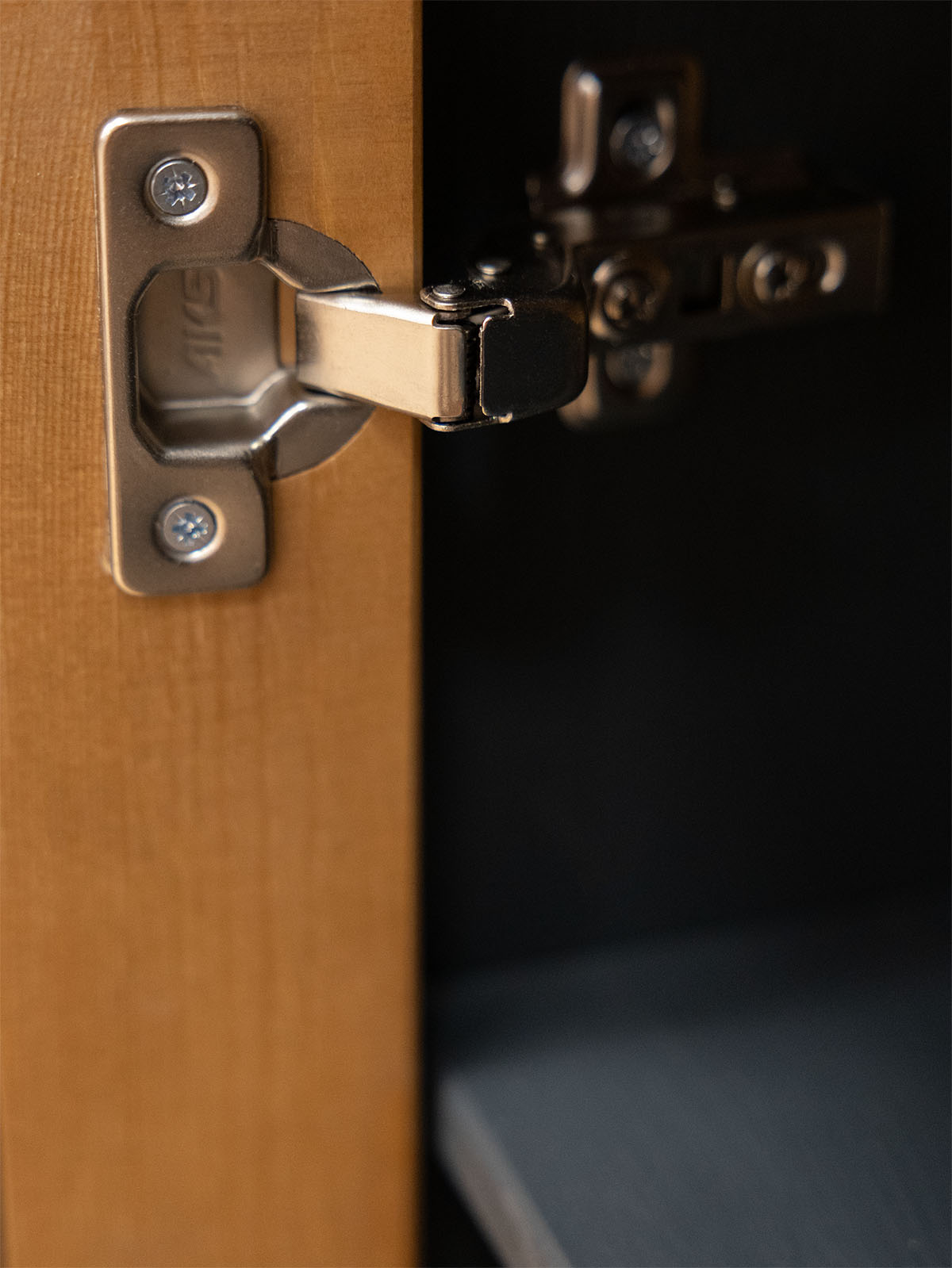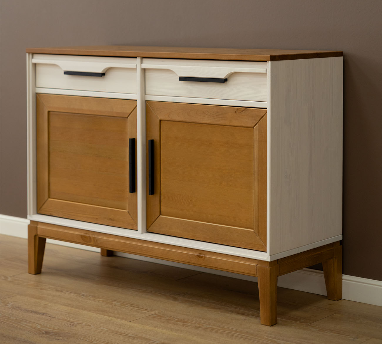 Фурнитура: Направляющие скрытого монтажа с доводчиками, петли с доводчиками. Металлические черные ручки.
