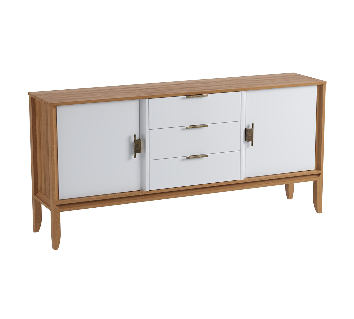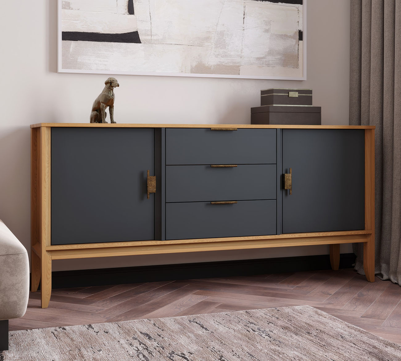Комод Бридж с дверцами и ящиками — гибридное решение для спален от 16 м², прихожих от 10 м² и гостиных от 18 м². Размещайте у длинной стены в нише шириной 190-200 см — горизонтальная конструкция 1800×852×400 мм сочетает открытое хранение в трёх ящиках и закрытое за двумя дверцами на петлях с доводчиками. Дверные секции скрывают объёмные предметы высотой до 75 см, выдвижные ящики организуют мелочи. Двухцветное исполнение из массива сосны с вальцовым окрашиванием создаёт гладкую поверхность в современных интерьерах.