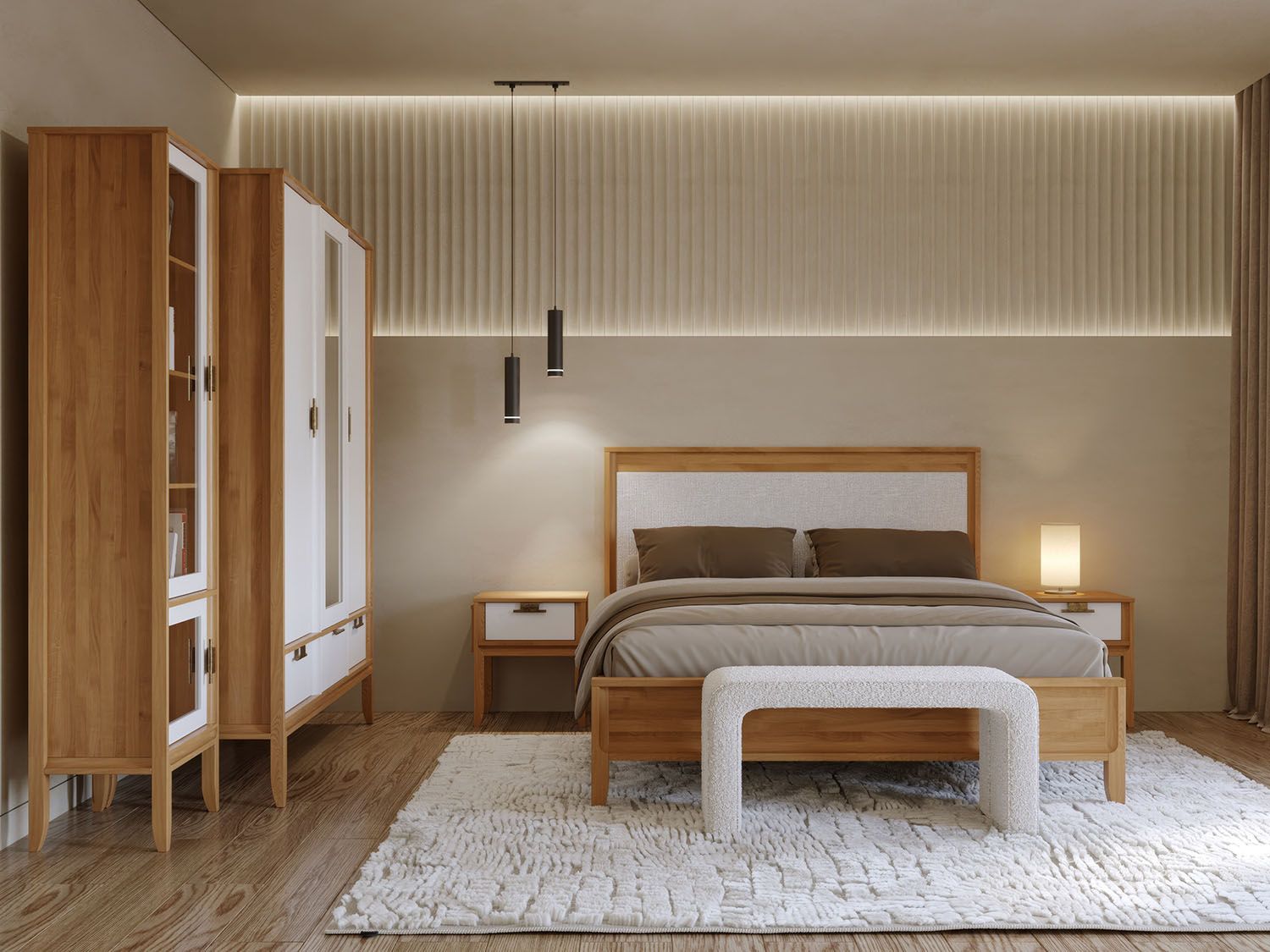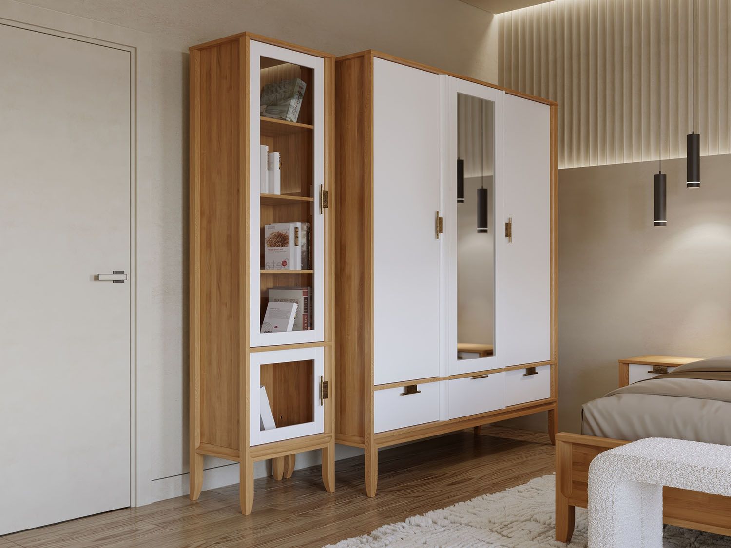 Комбинируйте с кроватью Бридж, комодом и прикроватными тумбами из коллекции для создания спального ансамбля в стиле минимализм. Центральное зеркало превращает шкаф в примерочную зону — разместите банкетку на расстоянии 100 см для примерки обуви сидя с обзором в полный рост. Дополните пространство напольной вешалкой справа для комплектов одежды при составлении образов.