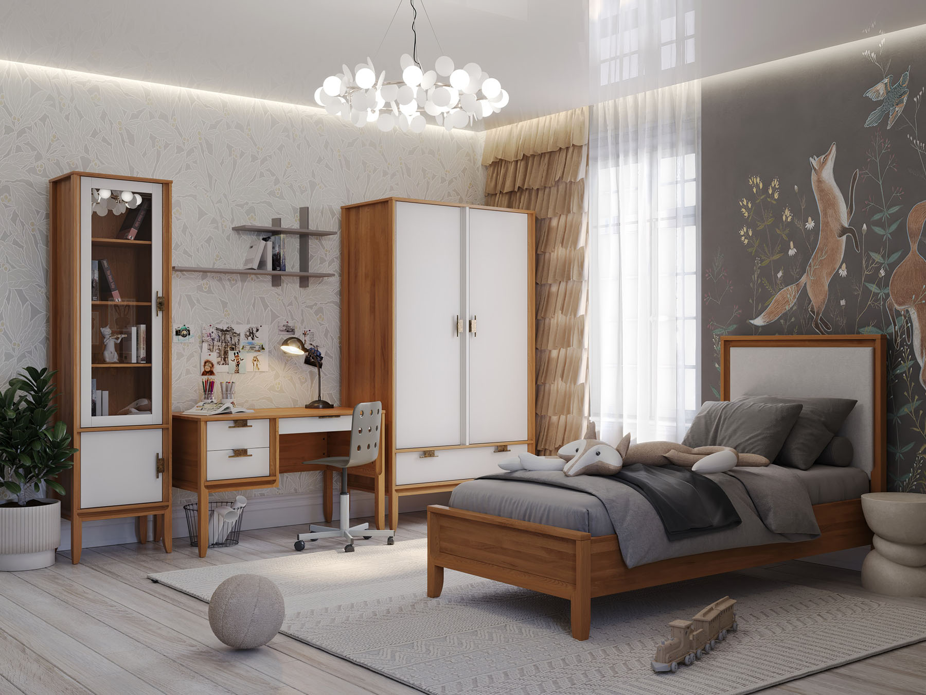 Комбинируйте с комодом Бридж, письменным столом и шкафом из коллекции для создания детской комнаты в стиле минимализм и скандинавской эстетики. Нейтральная двухцветная база позволяет менять цветовую концепцию комнаты по мере взросления ребёнка — от пастельных тонов для дошкольника до насыщенных акцентов для подростка — без замены мебели. Дополните пространство модульной системой открытого хранения с цветными коробами для игрушек и настенными наклейками со сменной тематикой.