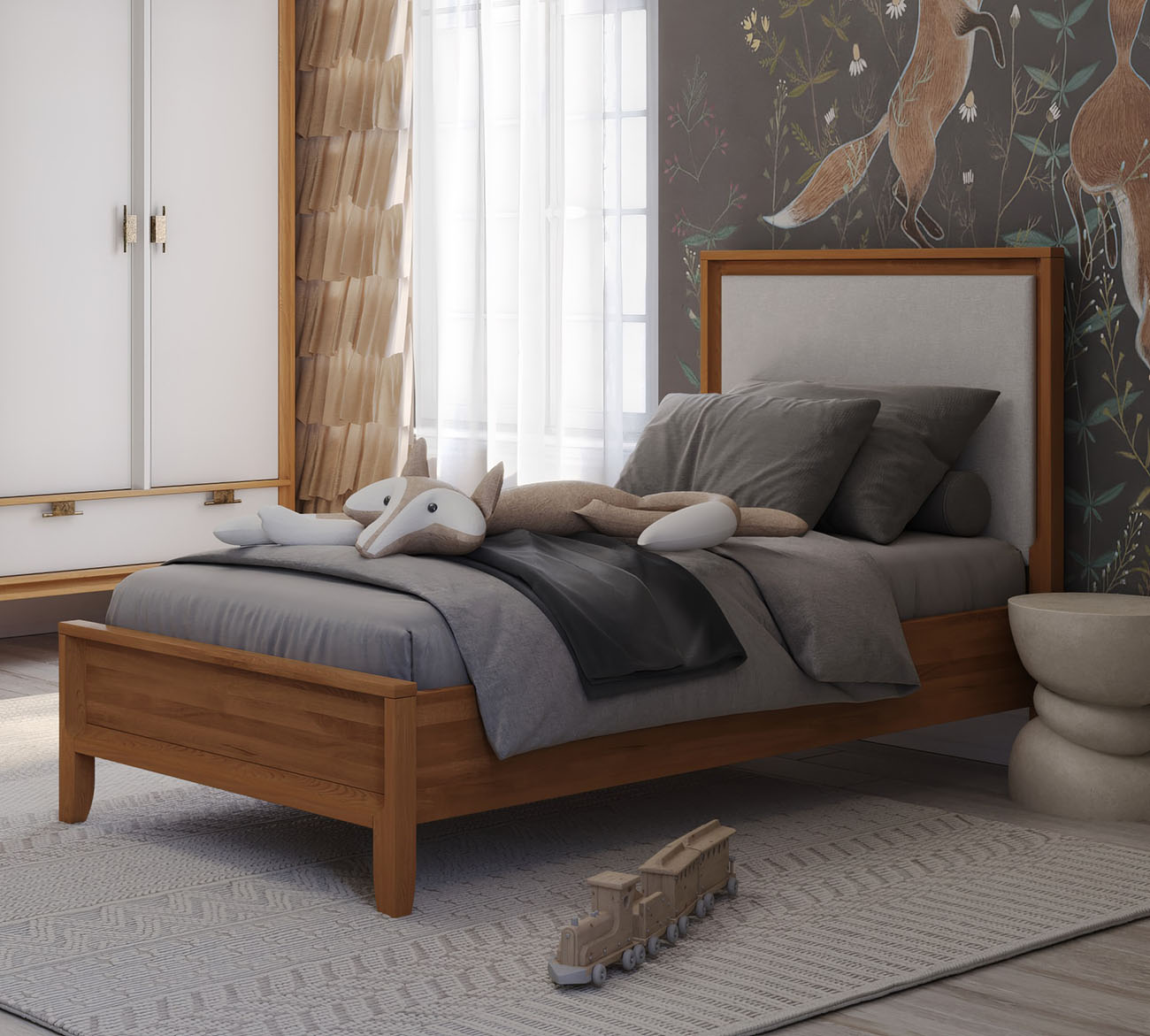 Кровать односпальная Бридж — универсальное решение для детских комнат от 9 м², гостевых спален от 10 м², кабинетов-гостевых от 12 м² и квартир-студий от 22 м². Размещайте изголовьем к длинной стене, оставляя минимум 50 см с открытой стороны для утренних сборов — противоположную сторону располагайте на расстоянии 5-10 см от стены для создания визуального единства. Лаконичное изголовье высотой 120 см без мягкой обивки облегчает уборку в детских комнатах — достаточно протереть влажной тканью без специального ухода за текстилем. Двухцветная комбинация браун и белого из массива сосны создаёт нейтральную базу для любой цветовой схемы детской или гостевой комнаты.