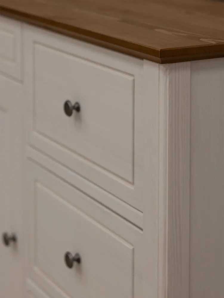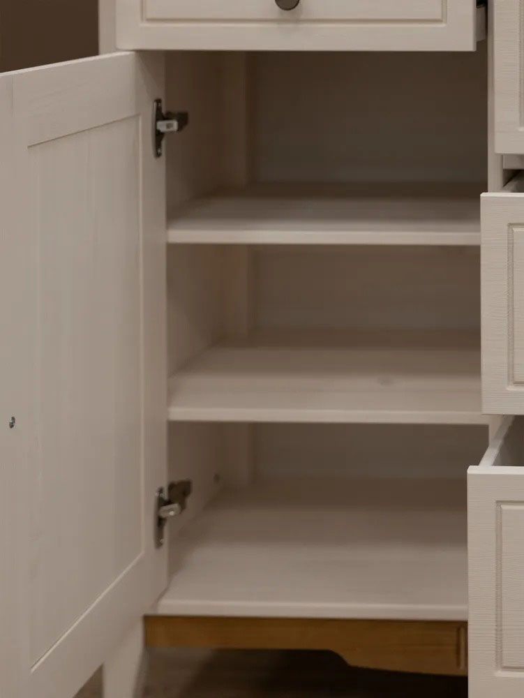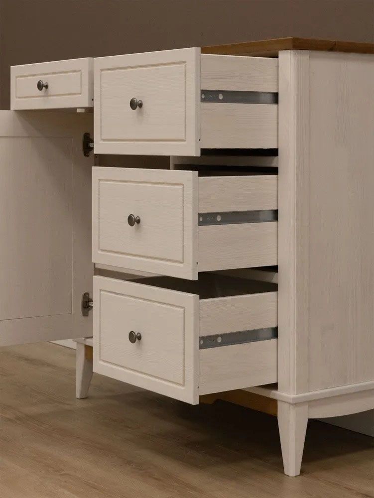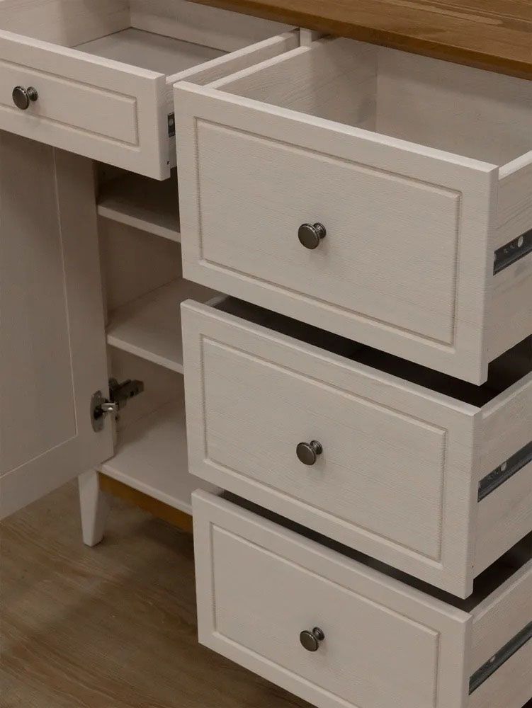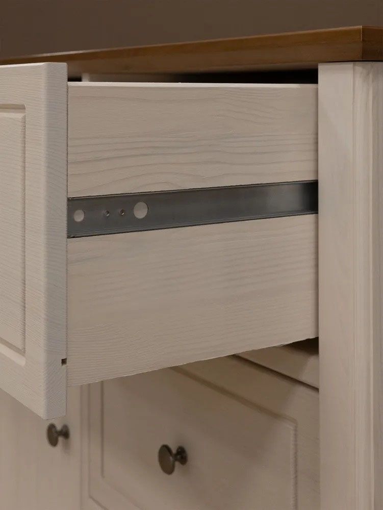 Фурнитура: Петли с доводчиком вкладные. Направляющие шариковые частичного выдвижения, без доводчиков. Ручка кнопка (состаренное серебро)