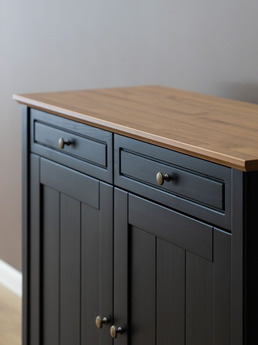 Фурнитура: Петли с доводчиком вкладные. Направляющие шариковые частичного выдвижения, без доводчиков. Ручка кнопка (состаренное серебро)