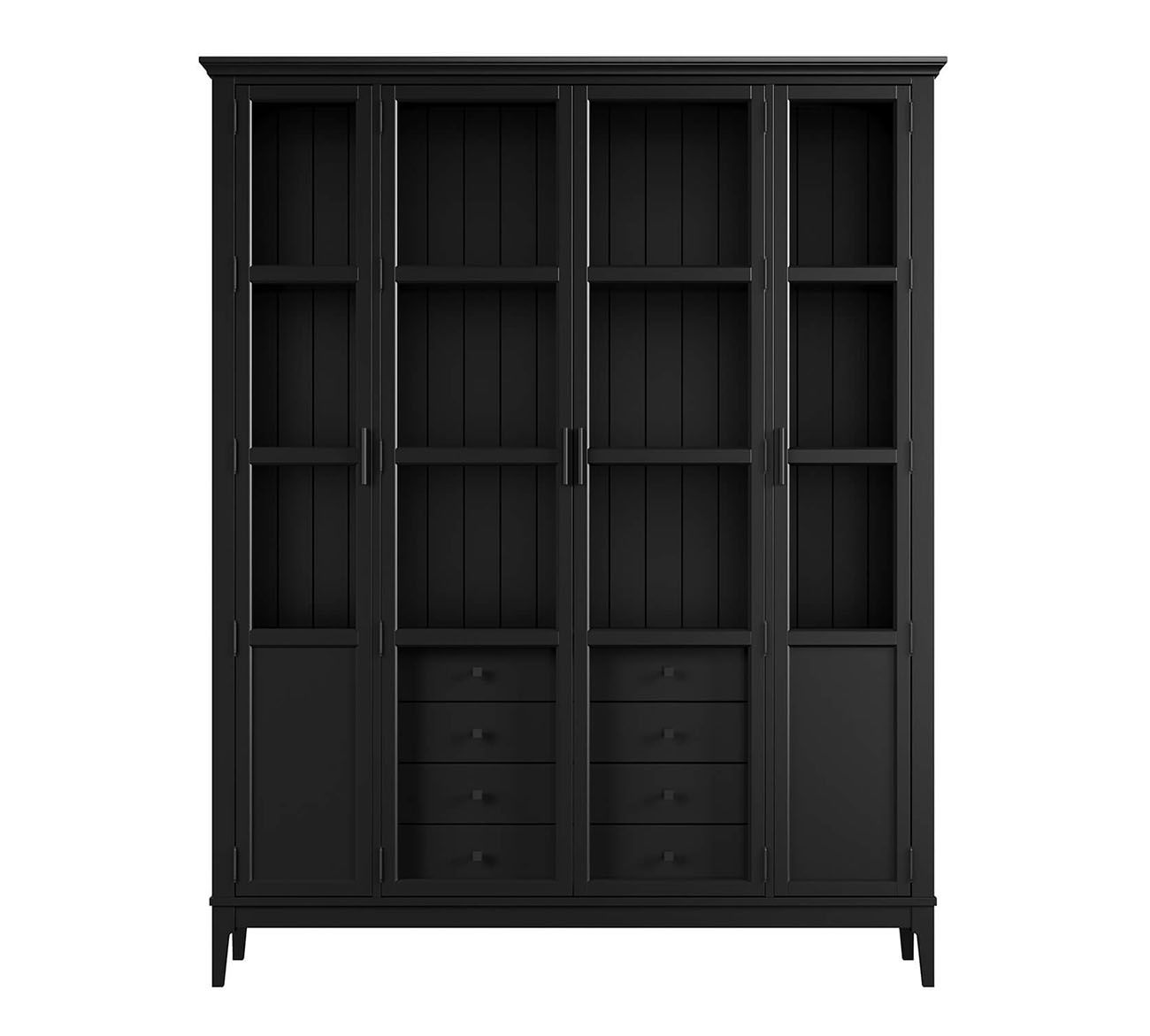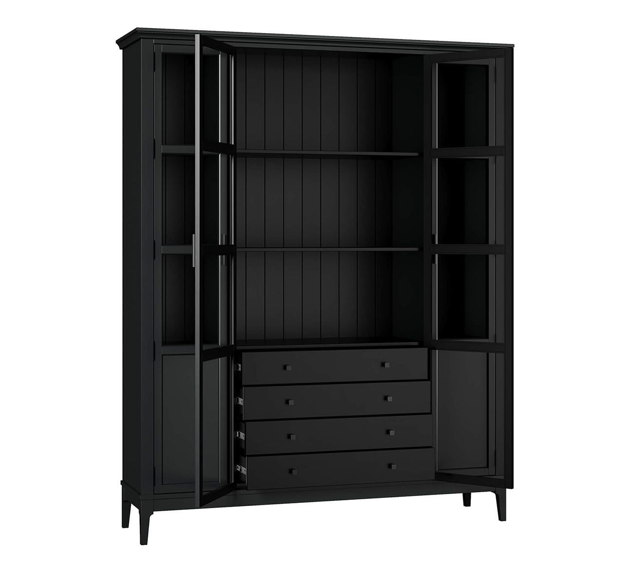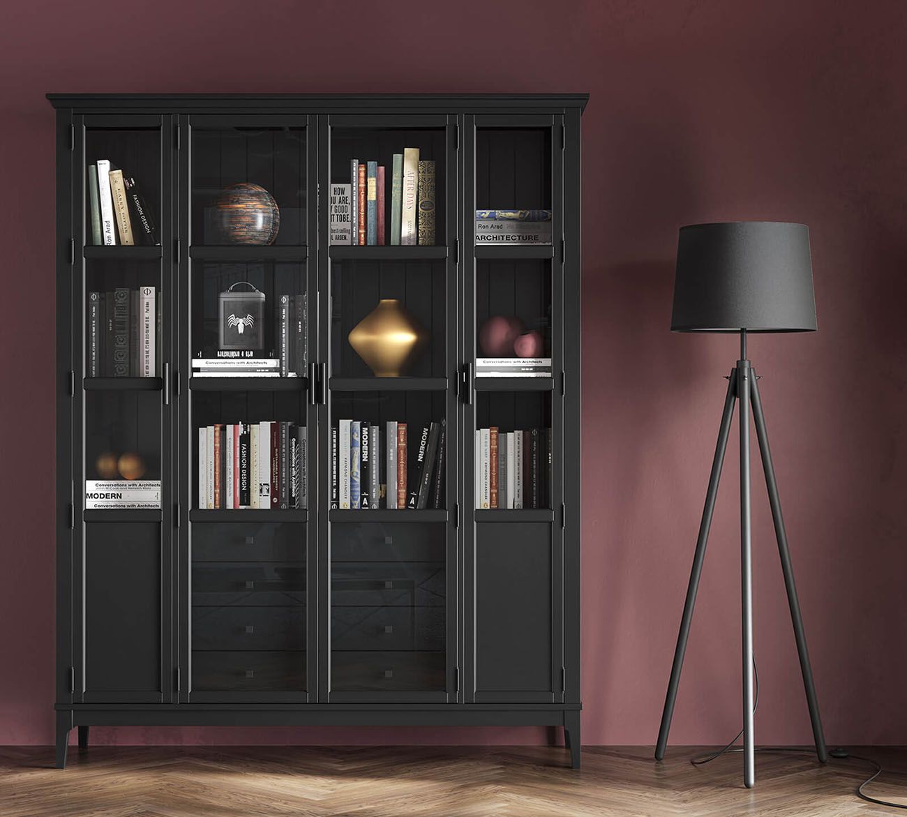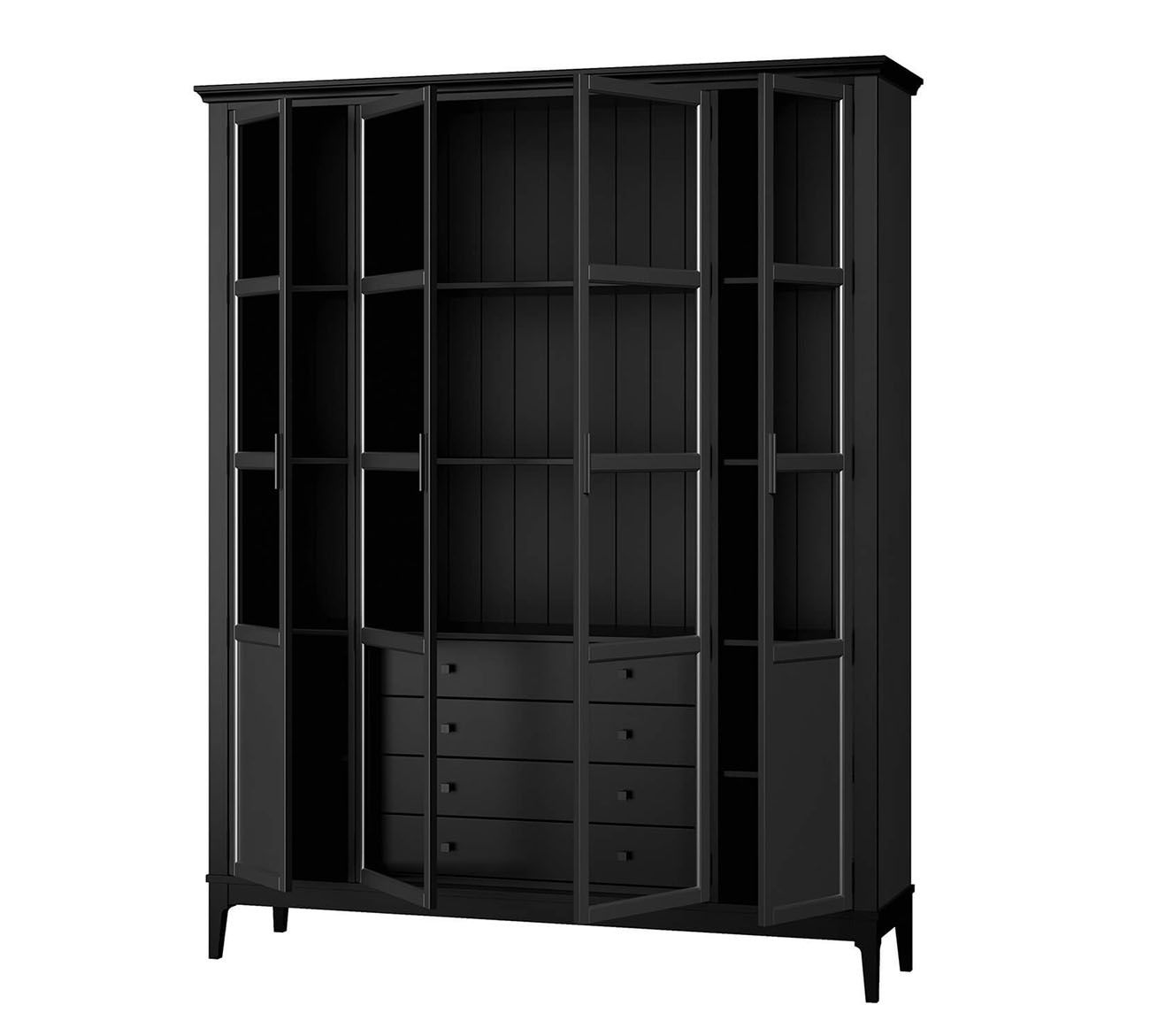 Комбинируйте со столом письменным Квадро-С 03, размещая его по центру кабинета лицом к окну, а шкаф — за спиной. В просторных кабинетах добавьте второй шкаф Квадро-С 422 напротив, формируя библиотечный коридор или открытым стеллажом Квадро-С 20 для баланса закрытого и открытого хранения. В гостиных-библиотеках комбинируйте с тумбой ТВ Квадро-С 42, создавая асимметричную композицию. Оставляйте минимум 120 см между шкафом и рабочим столом для комфортного перемещения и доступа к нижним полкам.