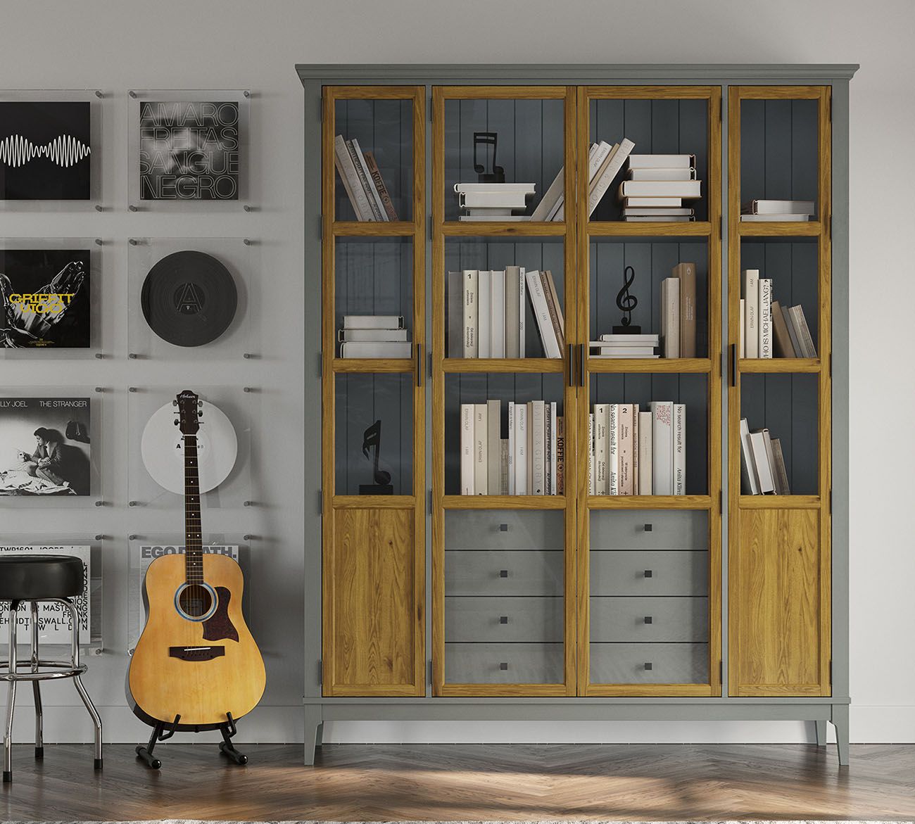 Натуральный массив сосны с закрытыми секциями работает как теплый контраст к холодным оттенкам стен — графитовым, темно-синим, оливковым — популярным в современных кабинетах. Глухие фасады формируют спокойный визуальный ритм, скрывая содержимое и добавляя интерьеру минималистичности. Располагайте шкаф вдали от прямых солнечных лучей, которые выцветляют книжные переплеты. Используйте направленную подсветку — трековые светильники на потолке, направленные на полки под углом 30-45 градусов.