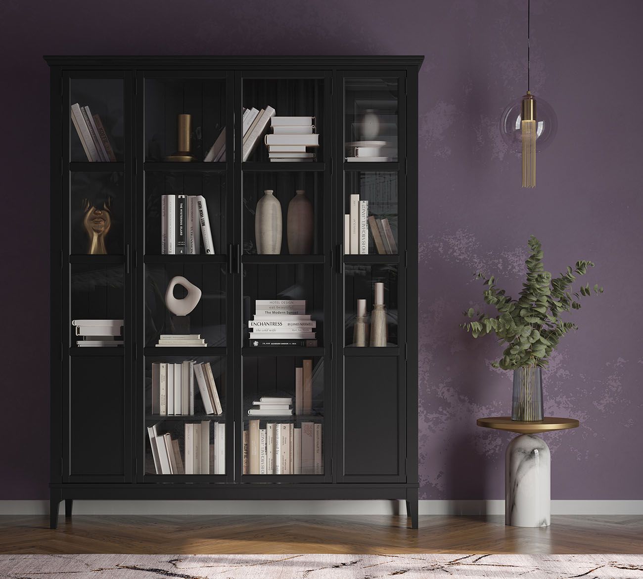 Комбинируйте со столом письменным Квадро-С 03, размещая его по центру кабинета лицом к окну, а шкаф — за спиной. В просторных кабинетах добавьте второй шкаф Квадро-С 422 напротив, формируя библиотечный коридор или открытым стеллажом Квадро-С 20 для баланса закрытого и открытого хранения. В гостиных-библиотеках комбинируйте с тумбой ТВ Квадро-С 42, создавая асимметричную композицию. Оставляйте минимум 120 см между шкафом и рабочим столом для комфортного перемещения и доступа к нижним полкам.