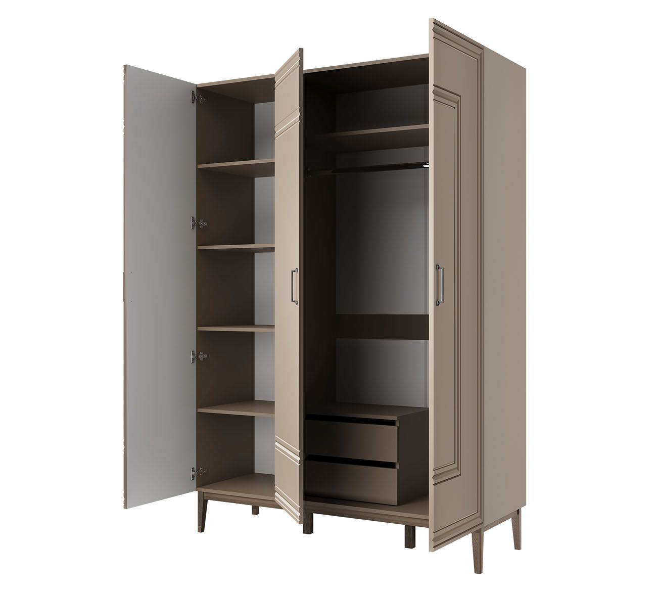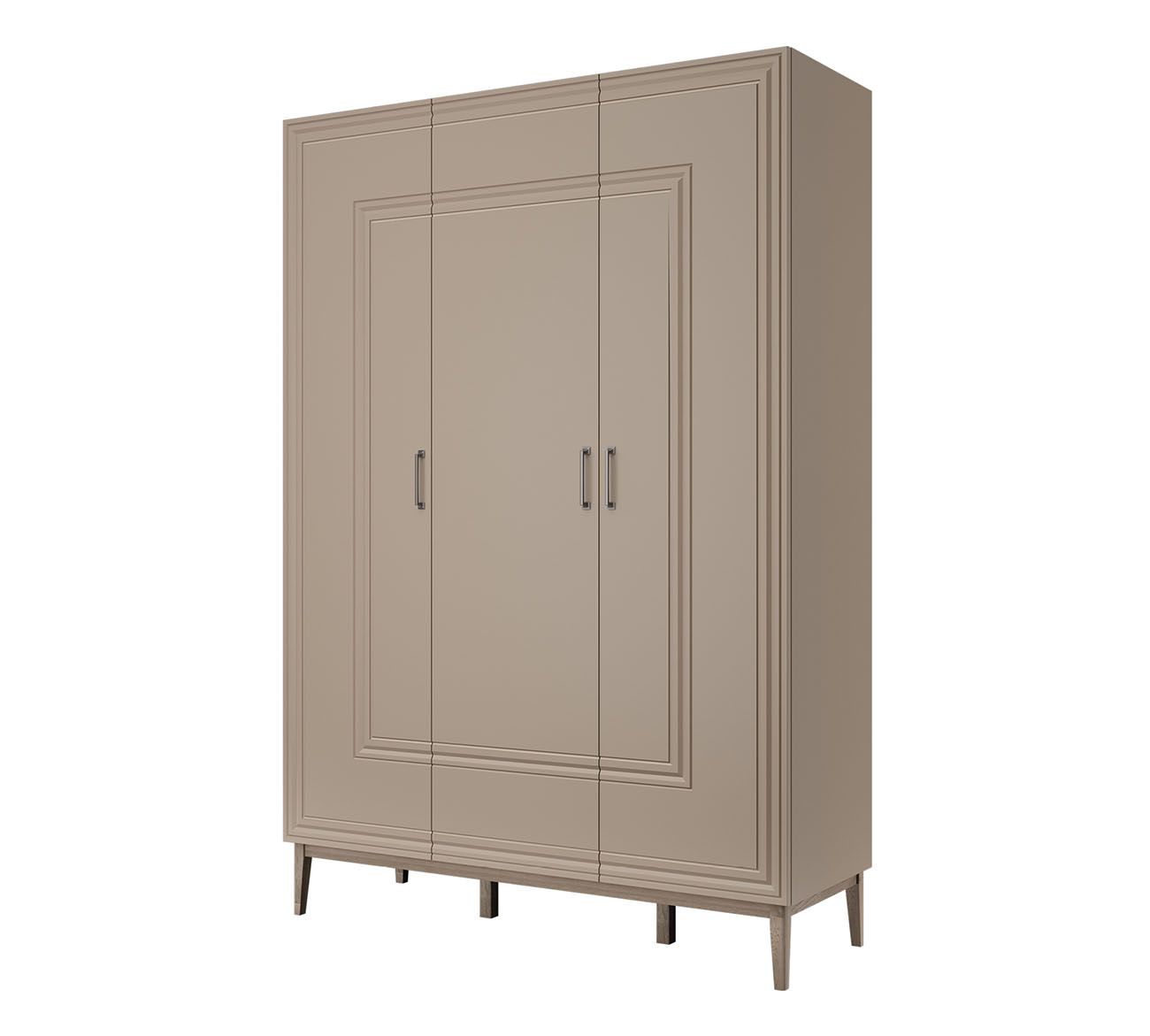Шкаф Гориция шириной 1511 мм и высотой 2181 мм — элегантное решение для спален от 11 м² и гардеробных от 7 м². Размещайте вдоль стены напротив кровати, оставляя минимум 90 см перед дверцами для комфортного открывания. В узких спальнях устанавливайте в простенке между окнами — глубина 519 мм оптимальна для хранения верхней одежды на плечиках без деформации. Три дверцы обеспечивают удобное зонирование внутреннего пространства для одежды разных сезонов и членов семьи.
