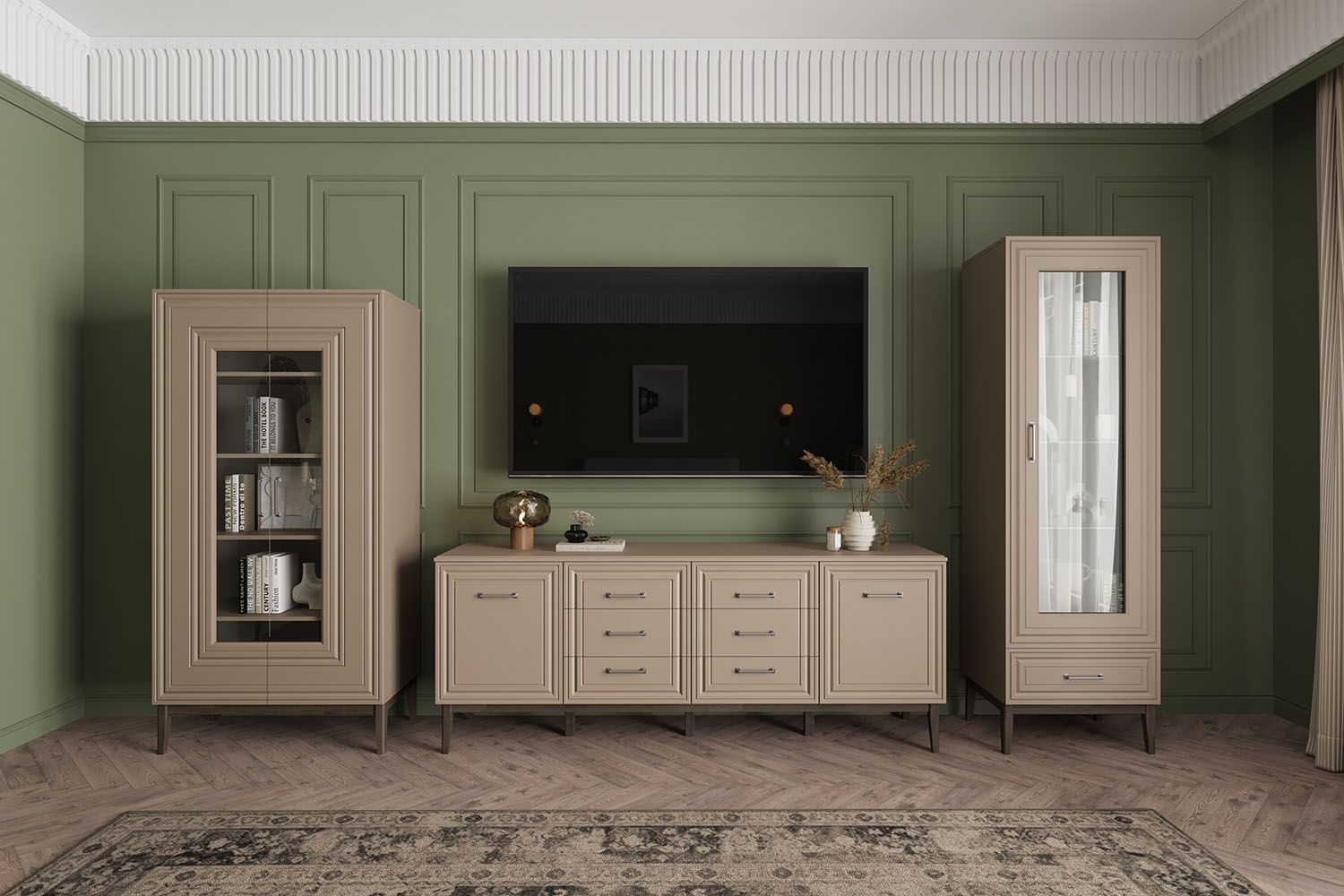 Комбинируйте с шкафом и витринами из коллекции Гориция для гармоничного ансамбля в едином цветовом решении. В спальнях формируйте композицию вдоль одной стены — шкаф справа, комод в центре. В гостиных используйте как центральный элемент между двумя витринами для баланса открытой демонстрации и закрытого хранения. Шесть ящиков — для белья и одежды, дверцы — для объемных предметов.