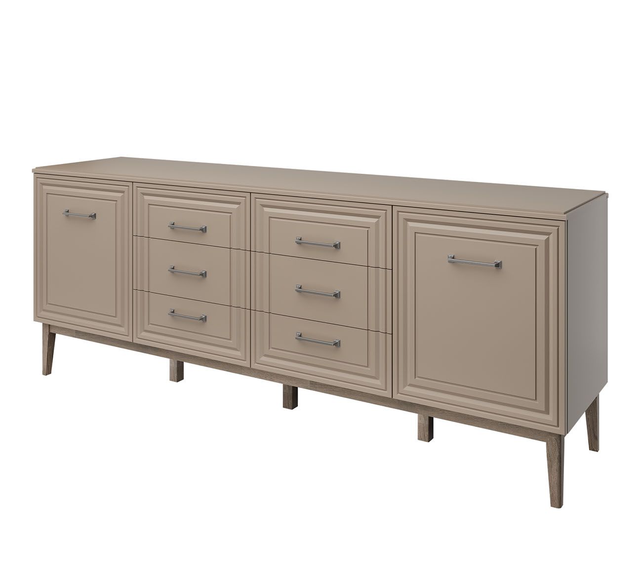 Комод Гориция шириной 1980 мм и высотой 772 мм — просторное решение для спален от 14 м², гостиных от 16 м² и гардеробных от 10 м². Размещайте вдоль длинной стены как главный элемент хранения, оставляя минимум 70 см для выдвижения ящиков. Горизонтальные пропорции визуально расширяют пространство — используйте как медиаконсоль под телевизор до 75 дюймов. Комбинация 6 ящиков и 2 дверей обеспечивает многоуровневое зонирование.