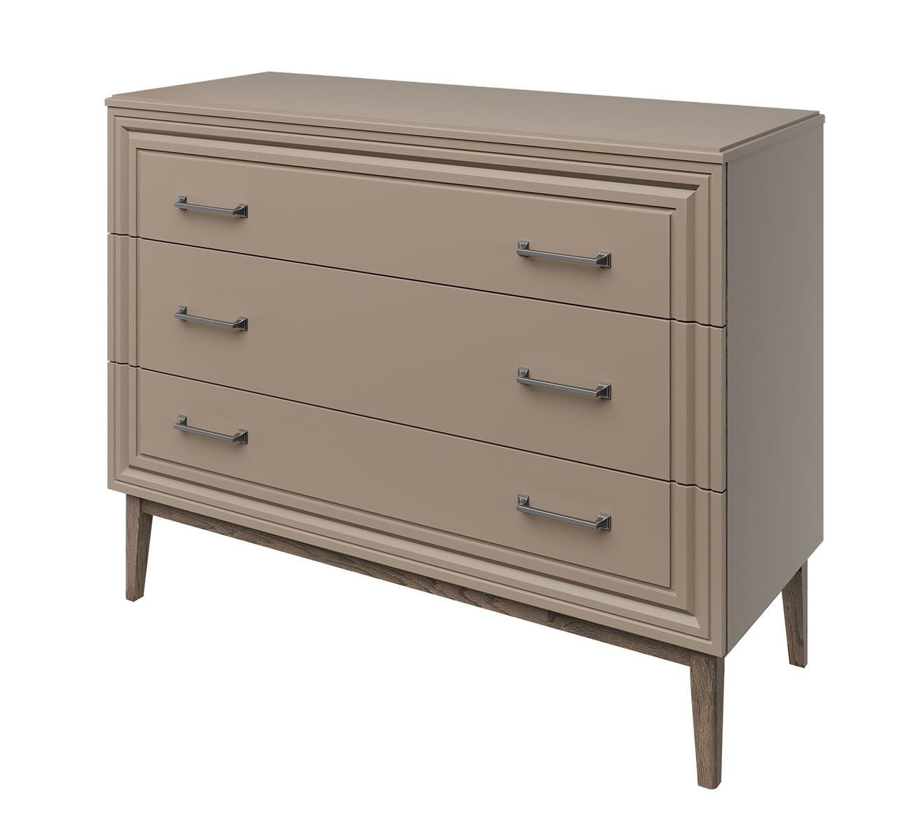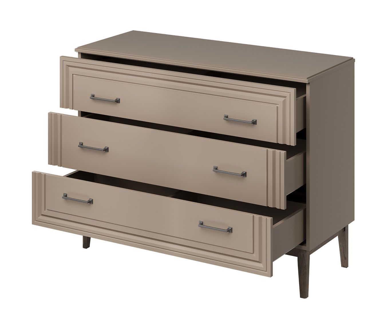 Комбинируйте с шкафом и тумбой ТВ из коллекции Гориция для гармоничного ансамбля в едином цветовом решении. В спальнях формируйте композицию вдоль одной стены — шкаф справа, комод слева от кровати. В гостиных используйте линейную планировку: витрина, тумба ТВ, комод — для баланса открытого и закрытого хранения. Три ящика с шариковыми направляющими обеспечивают плавное выдвижение.