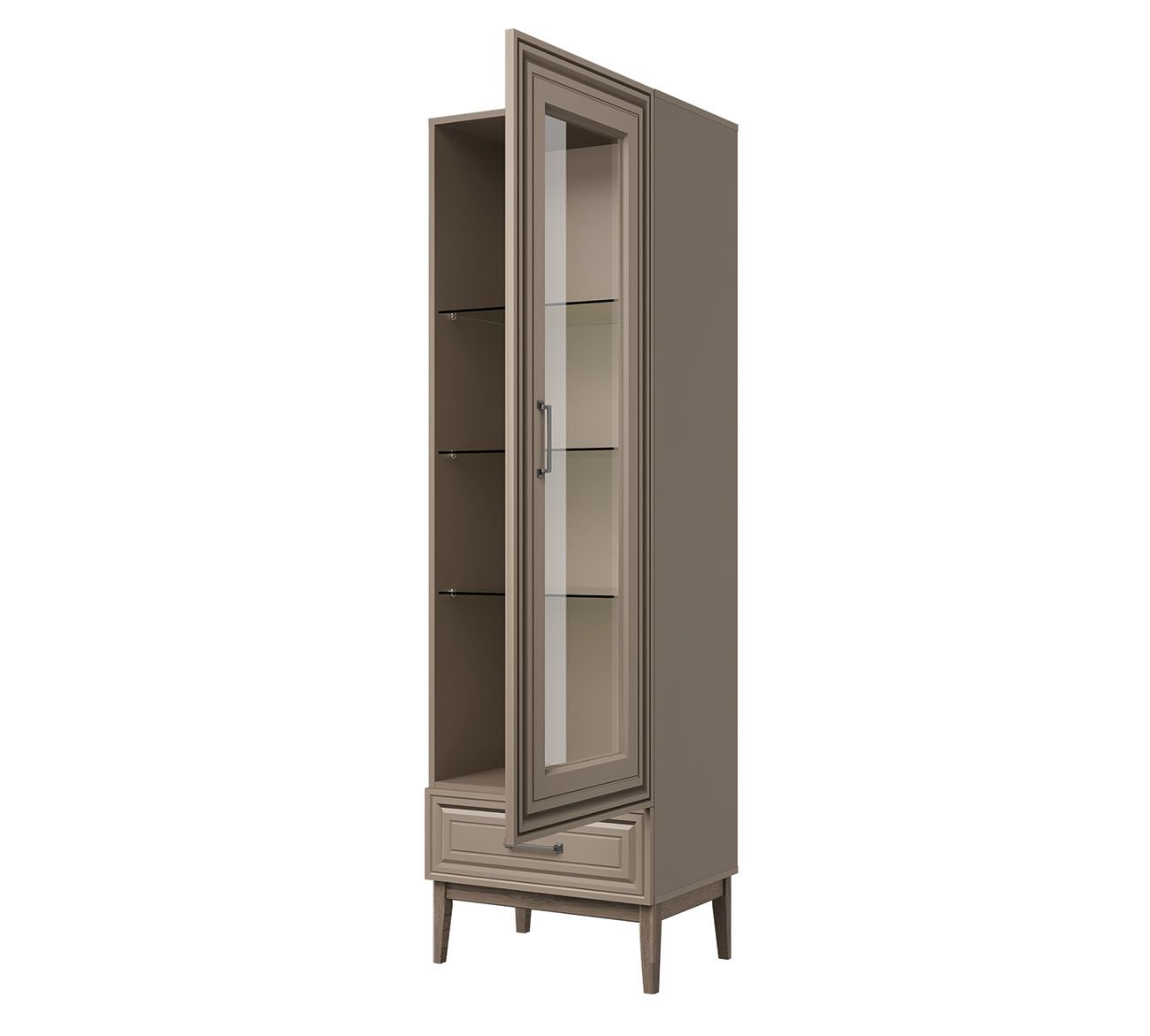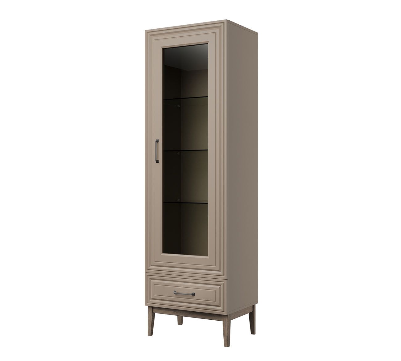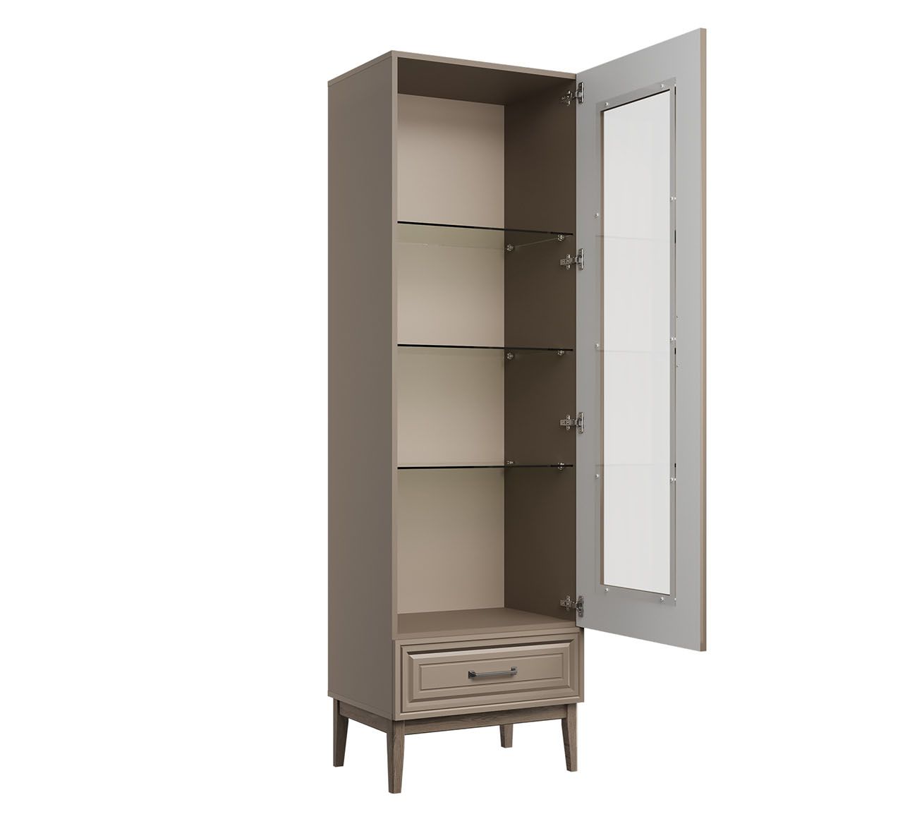 Шкаф-витрина Гориция шириной 600 мм и высотой 2000 мм — элегантное решение для гостиных от 9 м², столовых от 8 м² и кабинетов от 7 м². Размещайте в простенке между окнами или в углу для демонстрации коллекций, оставляя минимум 50 см перед дверцей. Узкая ширина 600 мм позволяет установку в ограниченных пространствах, создавая вертикальный акцент без перегрузки площади. Застекленный фасад защищает экспонаты от пыли.