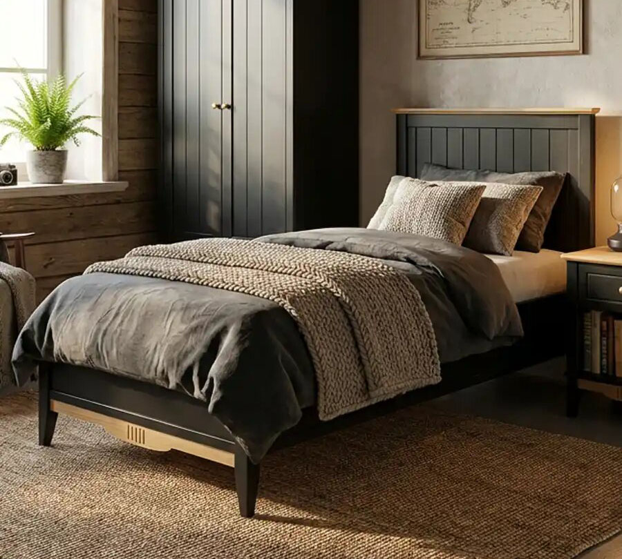 Кровать односпальная Пенни Блэк шириной 950 мм и высотой 900 мм — компактное решение для спален и детских комнат площадью от 10 м², где важен баланс между ложем и свободным пространством. Размещайте изголовьем к самой длинной стене, оставляя минимум 60 см с рабочей стороны и 50 см у изножья для комфортного перемещения. В узких детских ставьте вдоль стены, экономя пространство для игровой зоны.
