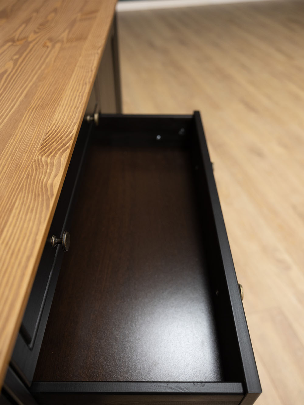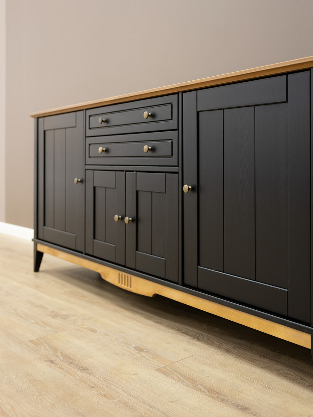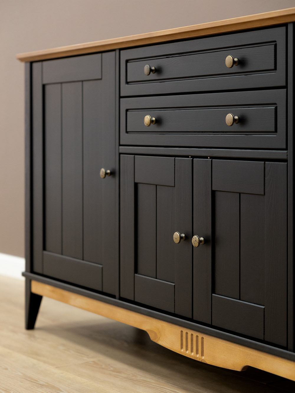 Фурнитура: Петли с доводчиком вкладные. Направляющие скрытого монтажа с доводчиками. Ручка кнопка (состаренное серебро).