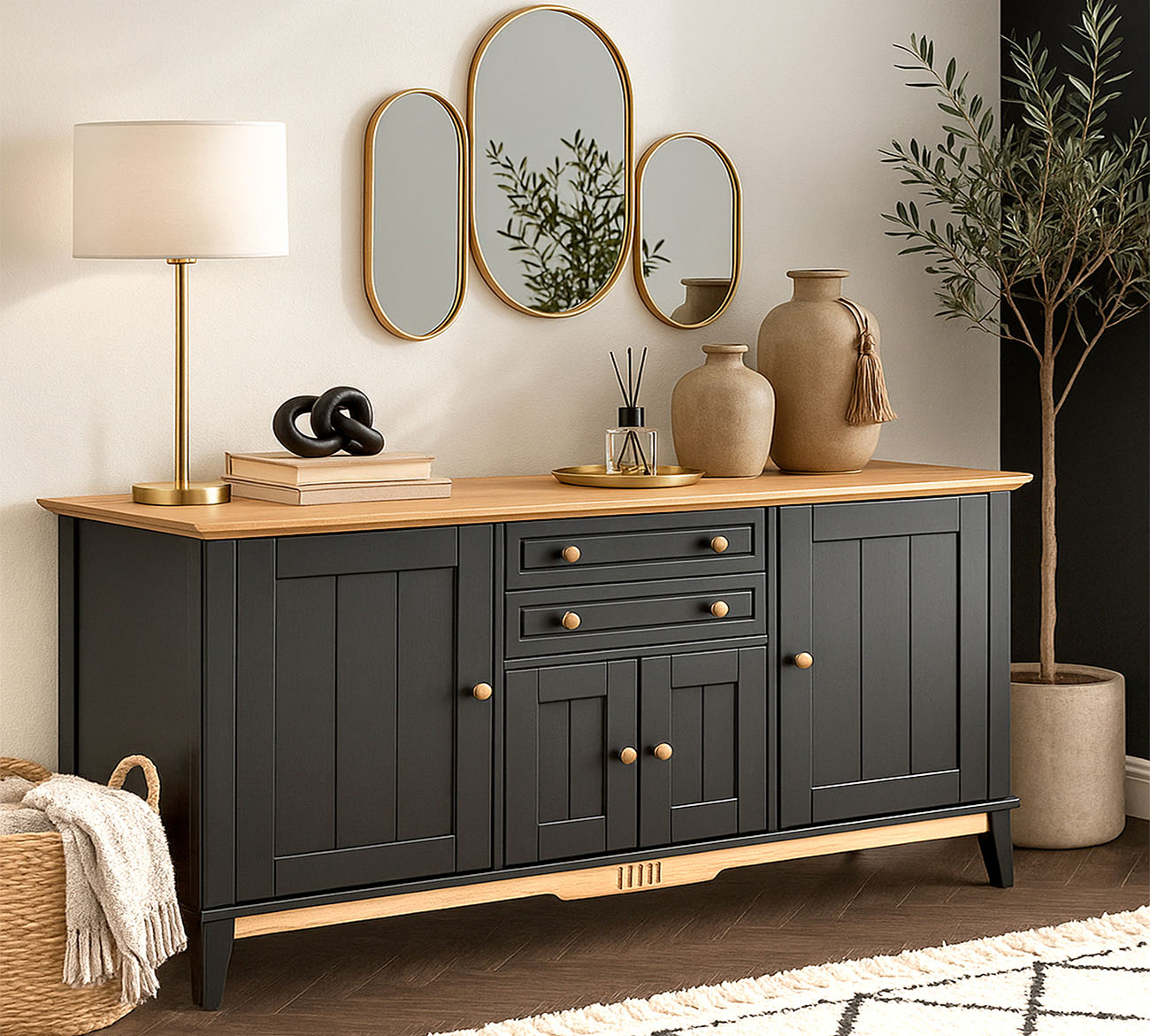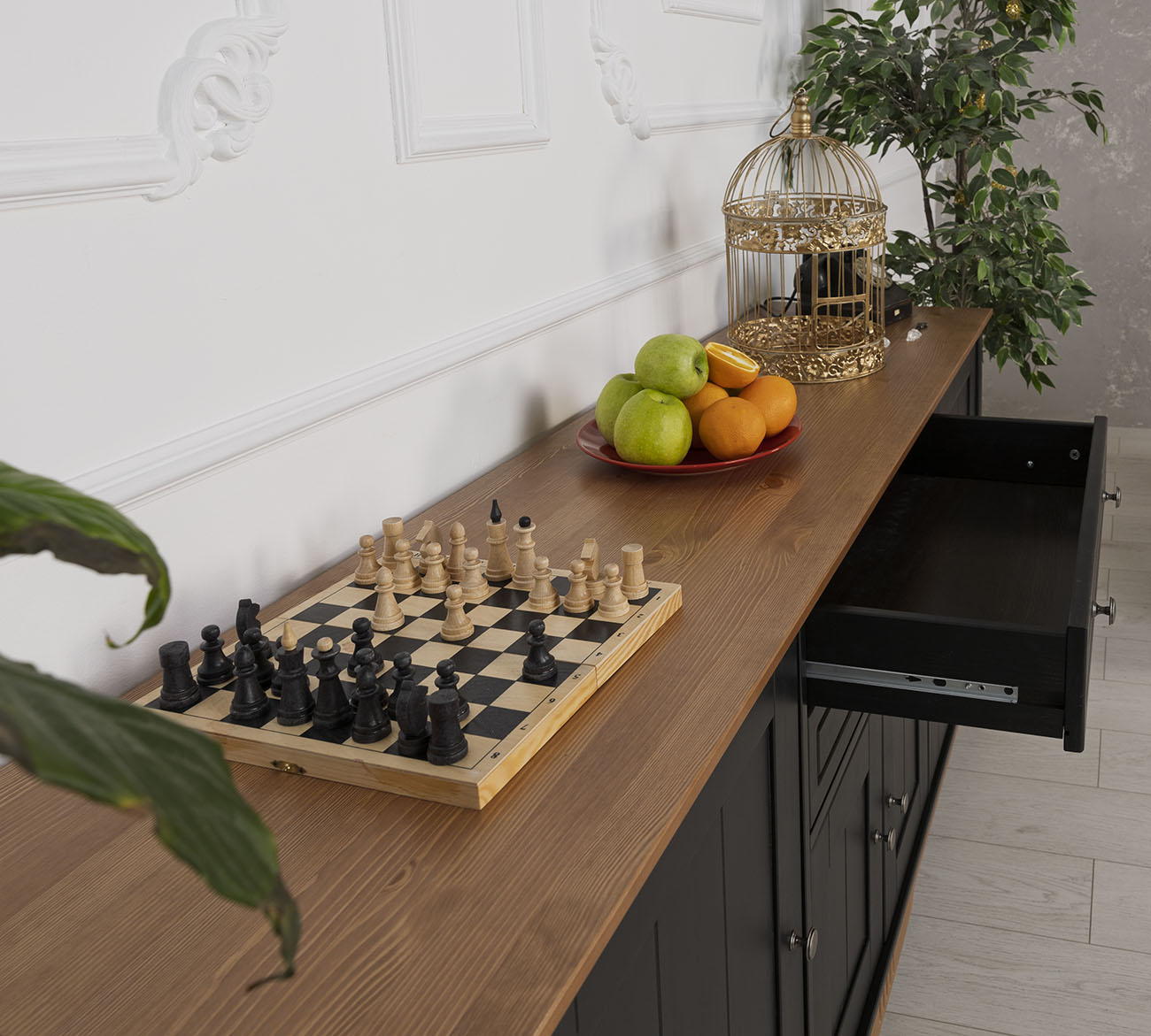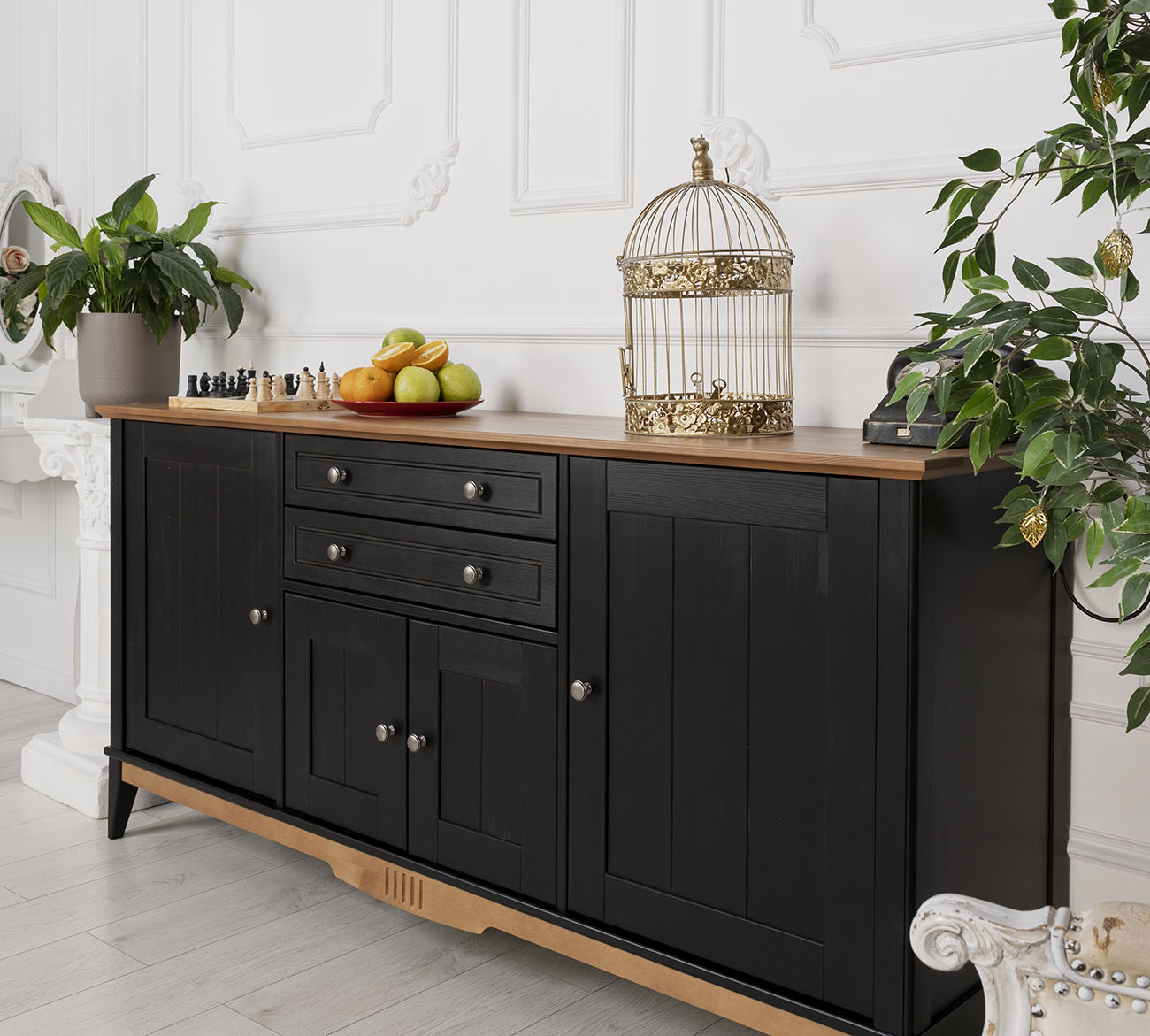 Фурнитура: Петли с доводчиком вкладные. Направляющие скрытого монтажа с доводчиками. Ручка кнопка (состаренное серебро).