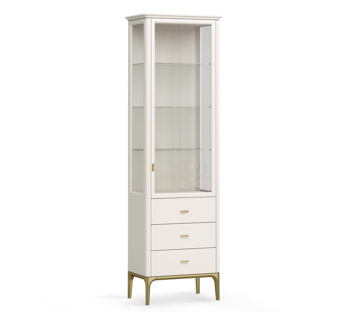 Особенности: Корпус поставляется в собранном виде. Требуется установка крышки и основания с ножками. Витрина с правым открыванием двери. Верхняя часть витрины окрашена в цвет светлый беж (K07 - ближайший RAL 9001), низ золотая патина.