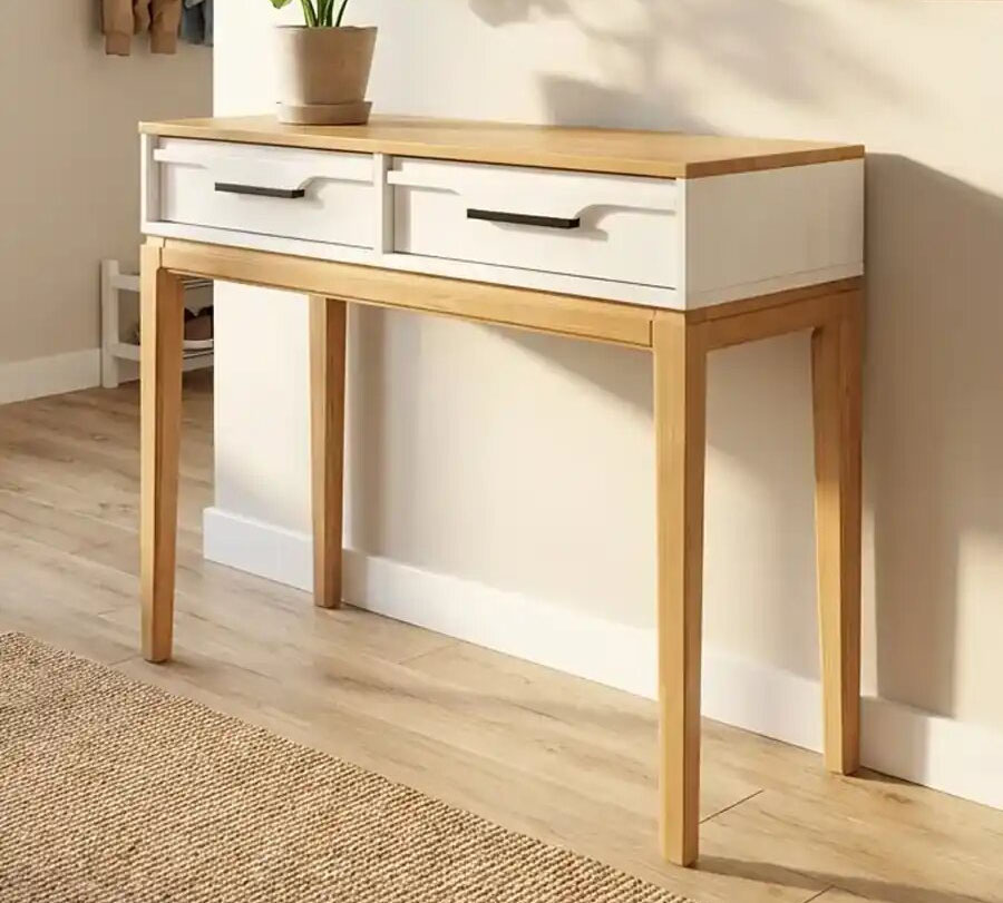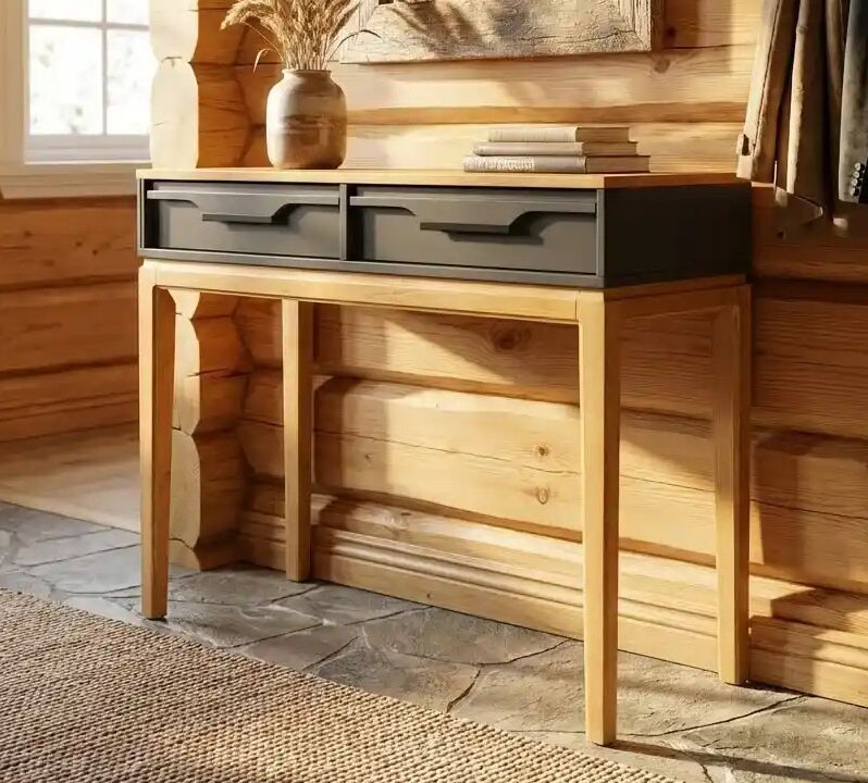 Туалетный стол (консоль) 02 Гранада отлично дополнит интерьер спальни, прихожей или гостиной в разных стилях: скандинавском, классическом, винтаж, прованс, лофт. Столешница, ножки и изножье выкрашены в тон «антик», а фасады ящиков и боковины - в цвет «белый воск» или «серый». Через покрытие видна природная текстура сосны.