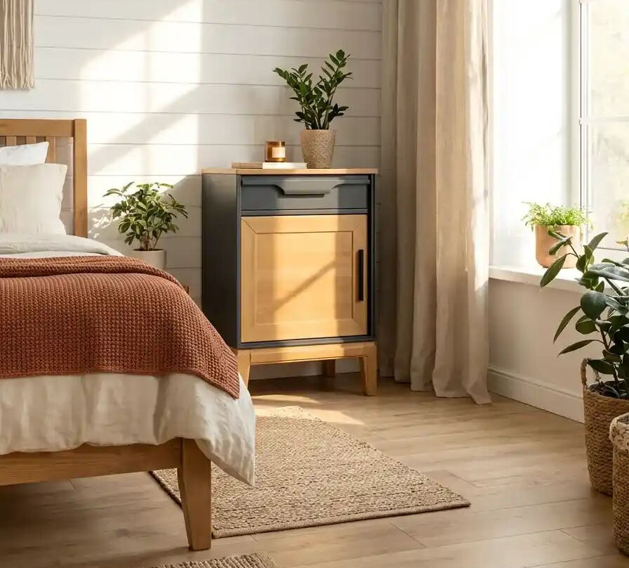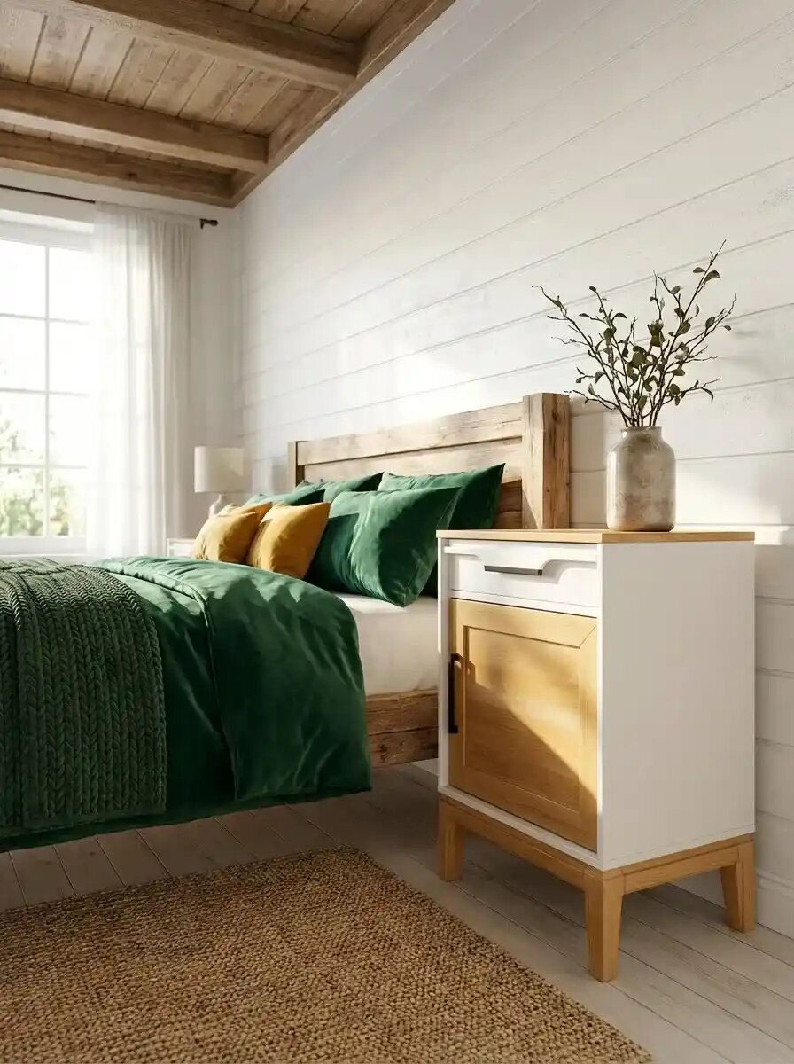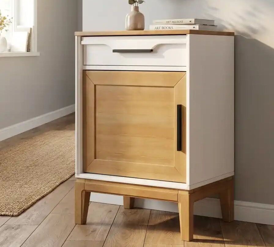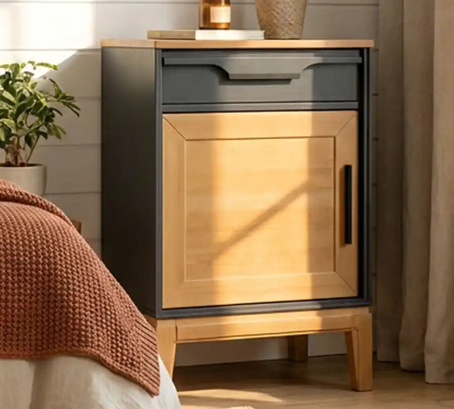 Прикроватная тумба 11 Гранада изготовлена полностью из массива сосны. Она отлично дополнит интерьер спальни в разных стилях: скандинавском, классическом, винтаж, прованс, лофт. Корпус и верхний фасад окрашены в цвет «белый воск» или «серый», а столешница, дверца и основание имеют контрастную отделку «антик 24». Через покрытие видна природная текстура сосны. Тумба оснащена одним выдвижным ящиком с интегрированной ручкой и отделением с распашной дверцей, на которой установлена минималистичная вертикальная ручка черного цвета. Высокие устойчивые ножки придают мебели визуальную легкость и облегчают уборку, в том числе с помощью робота-пылесоса.