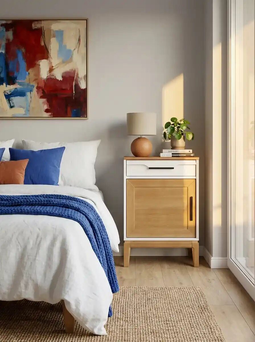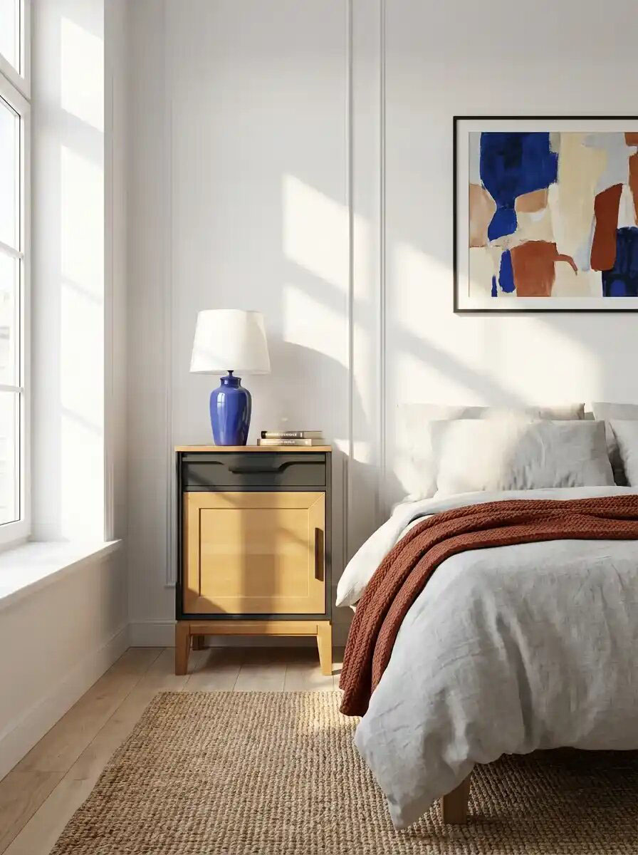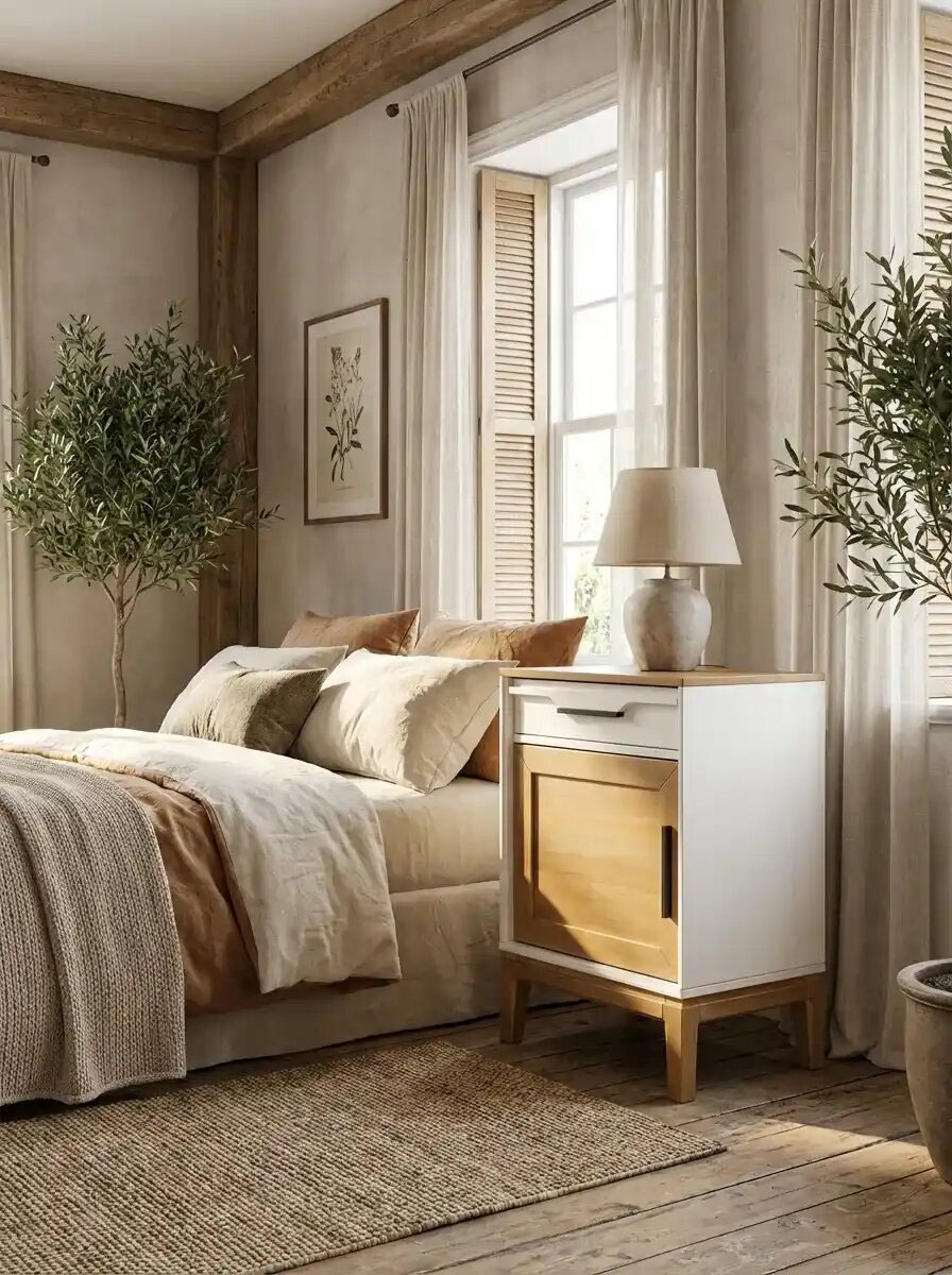 Прикроватная тумба 11 Гранада изготовлена полностью из массива сосны. Она отлично дополнит интерьер спальни в разных стилях: скандинавском, классическом, винтаж, прованс, лофт. Корпус и верхний фасад окрашены в цвет «белый воск» или «серый», а столешница, дверца и основание имеют контрастную отделку «антик 24». Через покрытие видна природная текстура сосны. Тумба оснащена одним выдвижным ящиком с интегрированной ручкой и отделением с распашной дверцей, на которой установлена минималистичная вертикальная ручка черного цвета. Высокие устойчивые ножки придают мебели визуальную легкость и облегчают уборку, в том числе с помощью робота-пылесоса.