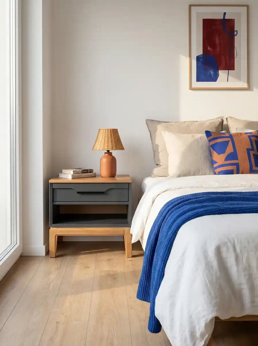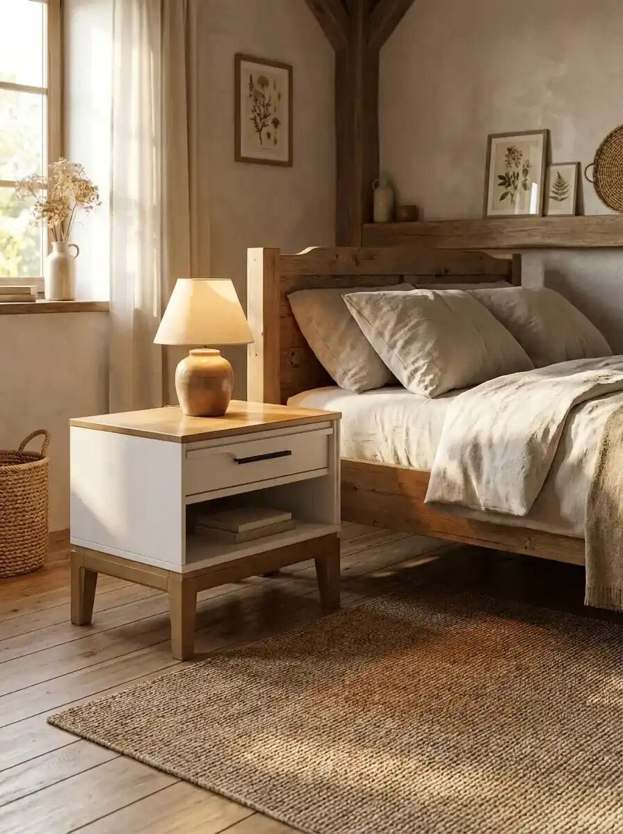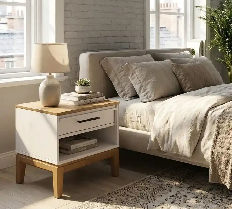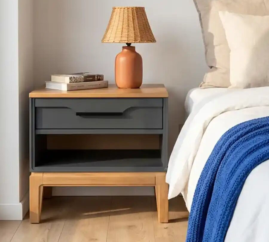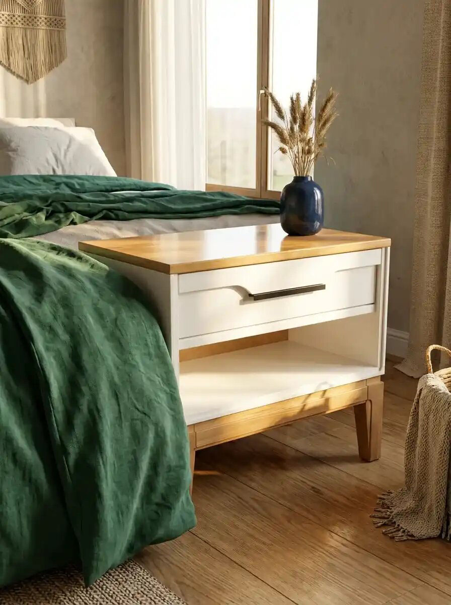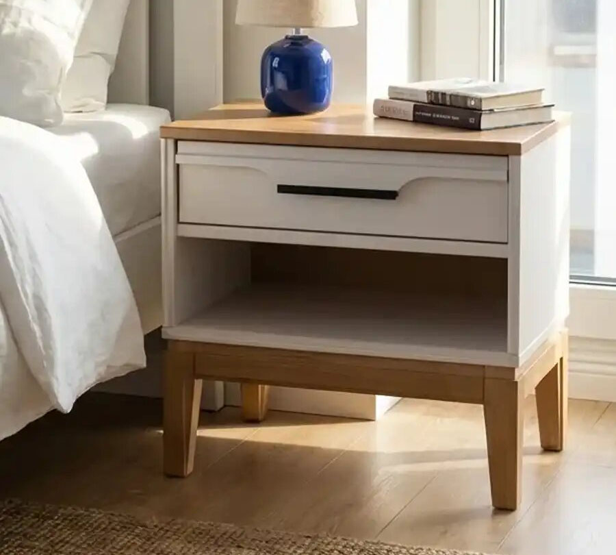 Прикроватная тумба 01 Гранада отлично дополнит интерьер спальни в разных стилях: скандинавском, классическом, винтаж, прованс, лофт. Корпус и фасад тумбы окрашены в цвет «белый воск» или «серый», а столешница и основание с ножками имеют контрастный оттенок «антик 24». Через покрытие видна природная текстура сосны. Модель оснащена одним выдвижным ящиком с интегрированной ручкой и открытой нишей, которая удобна для хранения книг или гаджетов. Высокие деревянные ножки придают мебели визуальную легкость и облегчают уборку, в том числе с помощью робота-пылесоса.