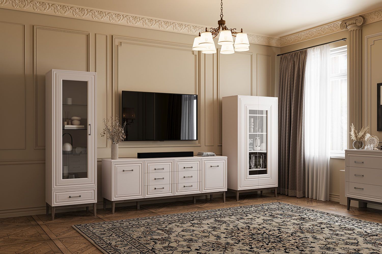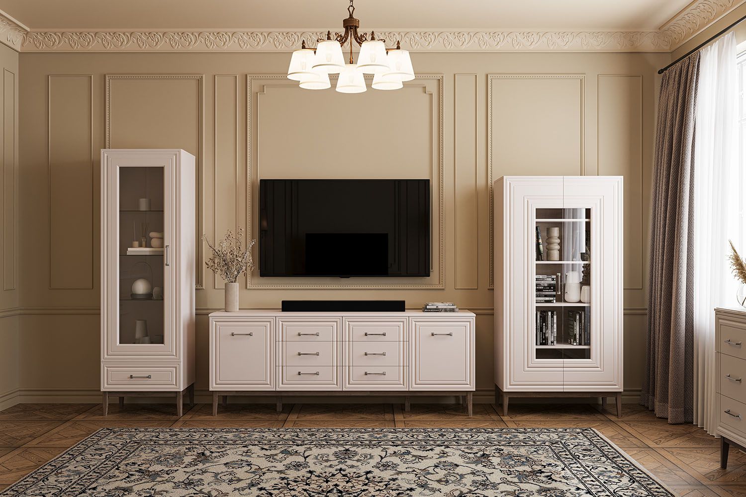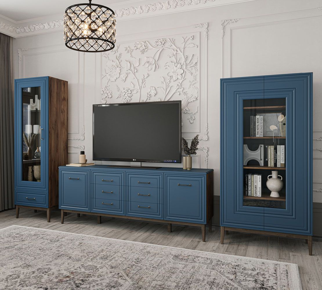 Материал: фасад - МДФ (лак сапфировый/льняной/зеленый самшит), корпус, задняя стенка - ЛДСП (таксус/персидский жемчуг/зеленый самшит), полки - стекло, опоры из массива