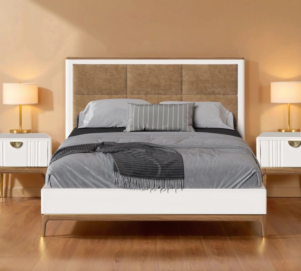 Кровать двуспальная Bari с мягкой вставкой. Лаконичные линии в духе модерна, подчеркнутые теплом натурального цвета ножек, превращают этот предмет мебели в практичный и оригинальный элемент интерьера.