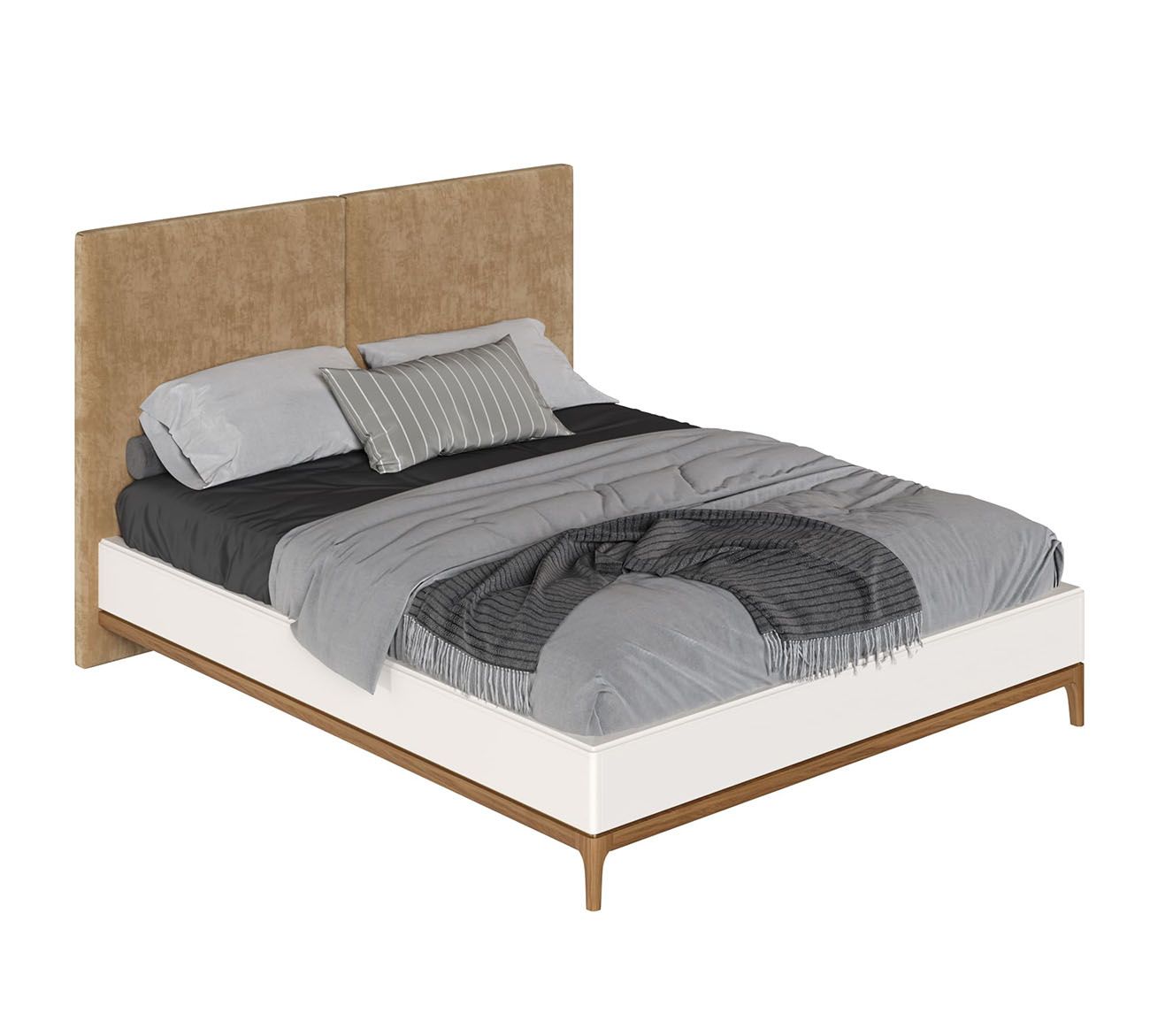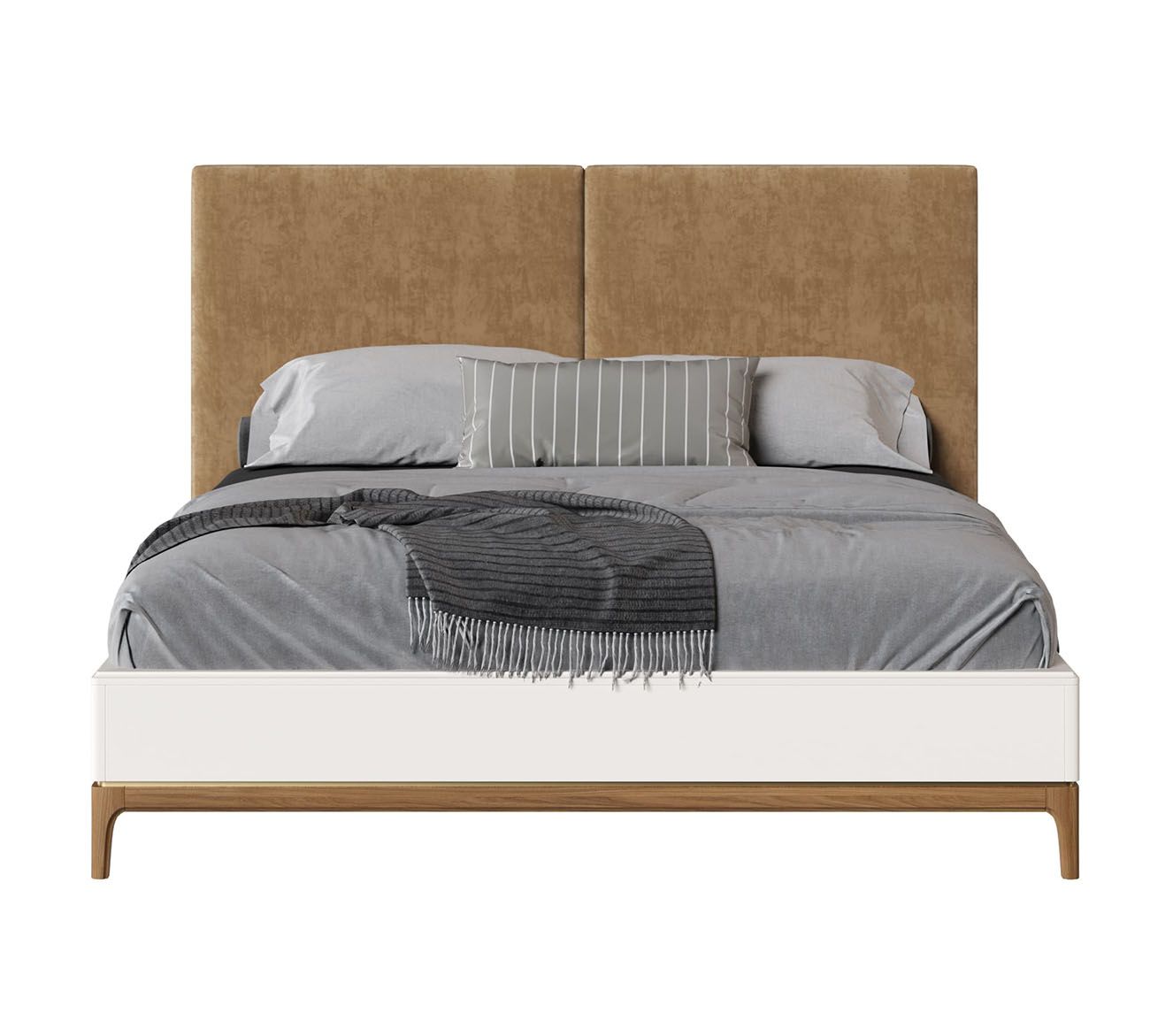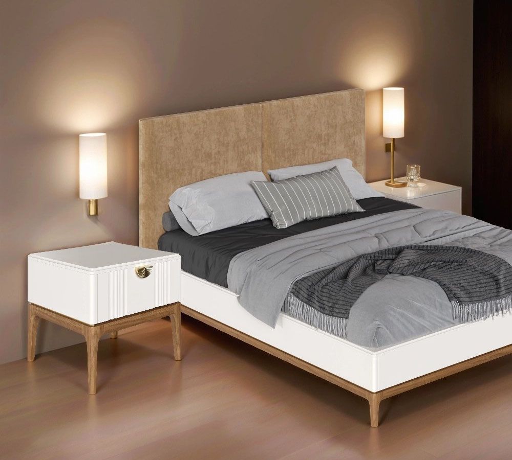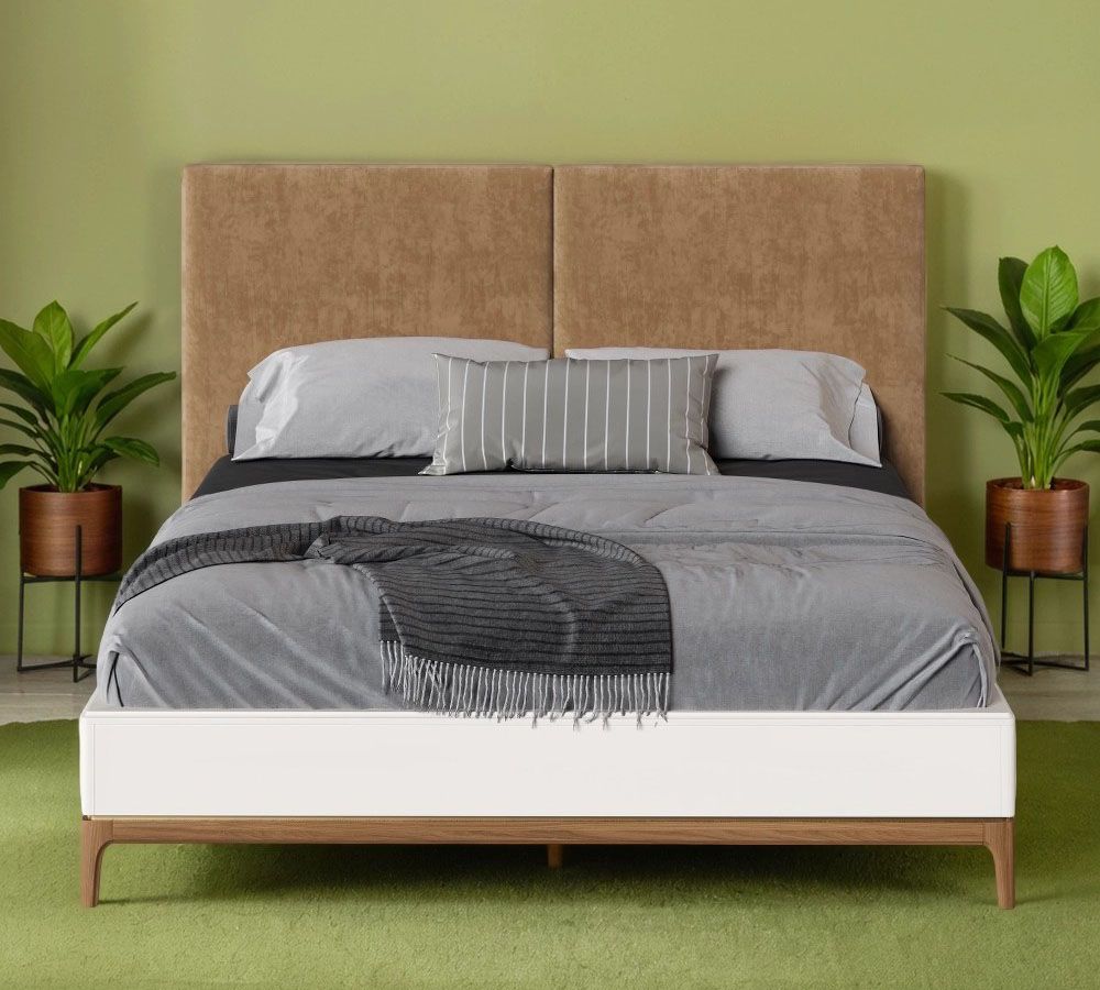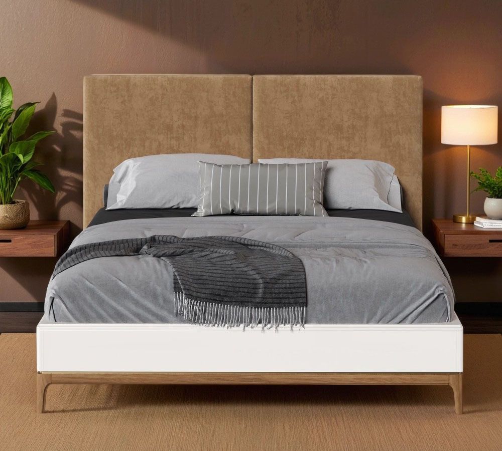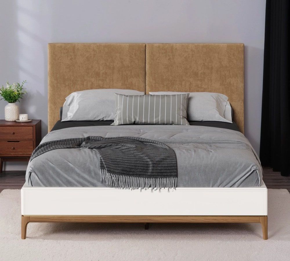Кровать двуспальная Bari с мягкой спинкой. Лаконичные линии в духе модерна, подчеркнутые теплом натурального цвета ножек, превращают этот предмет мебели в практичный и оригинальный элемент интерьера.