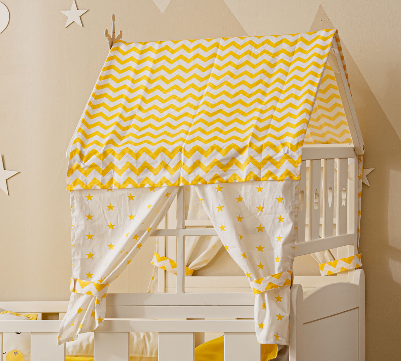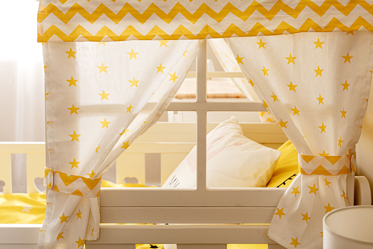 Накидка Тимберика Кидс №2 подходит к кровати Тимберика Кидс №2: Крыша с завязками, 4 тканевые занавески на сплошной липучке к крыше, 4 прихвата. Вариант ткани 1 (желтый): крыша - желтый зигзаг, 2 занавески - желтые звезды на белом, прихваты 2 шт- зигзаг. Вариант ткани 2 (синий): крыша - звезды на синем, 4 занавески- якоря, прихваты 4 шт - звезды на синем.