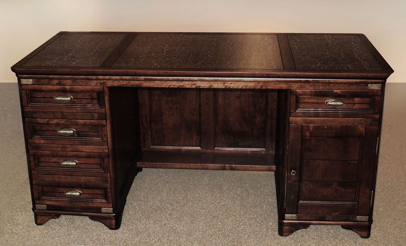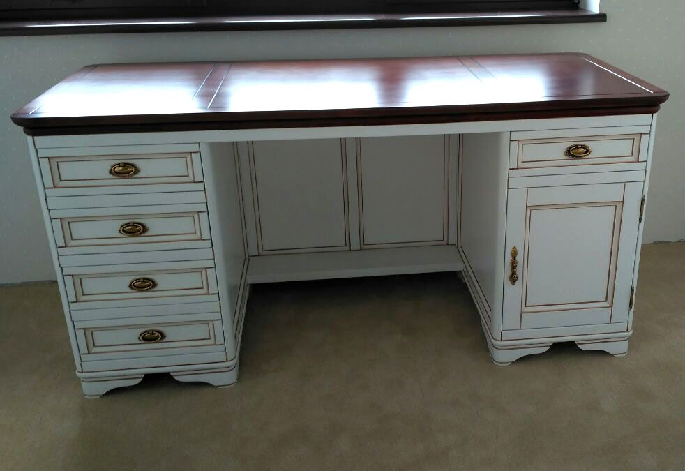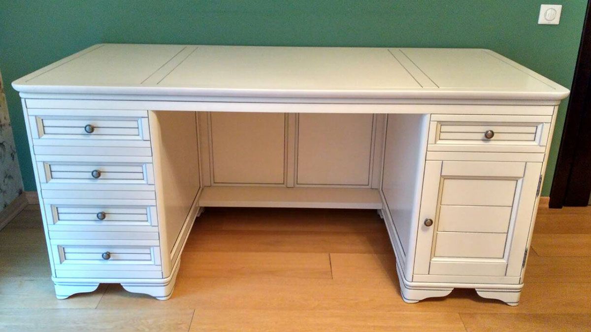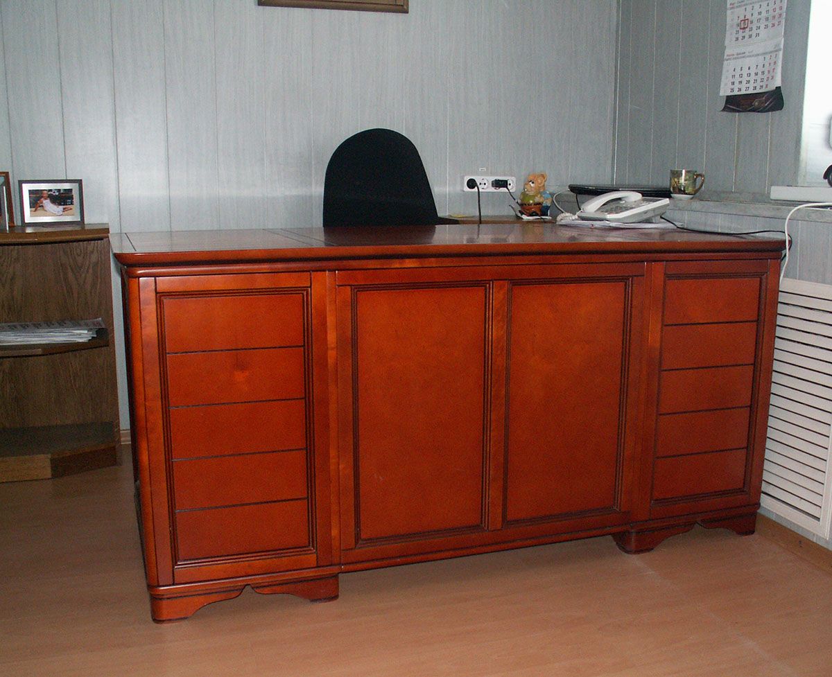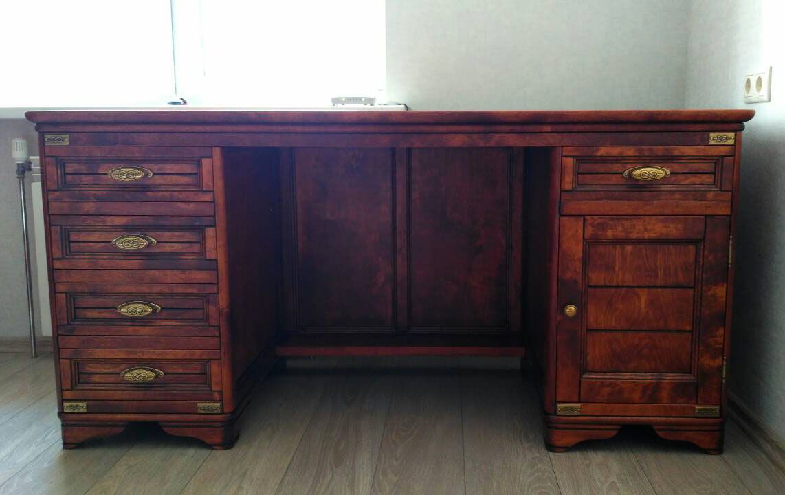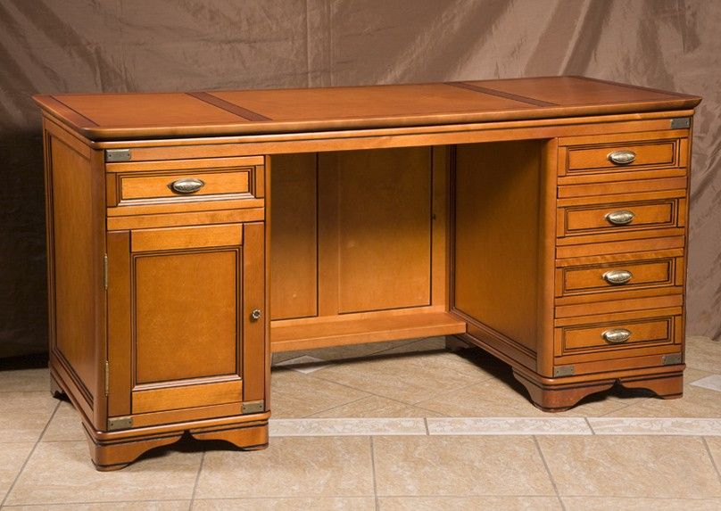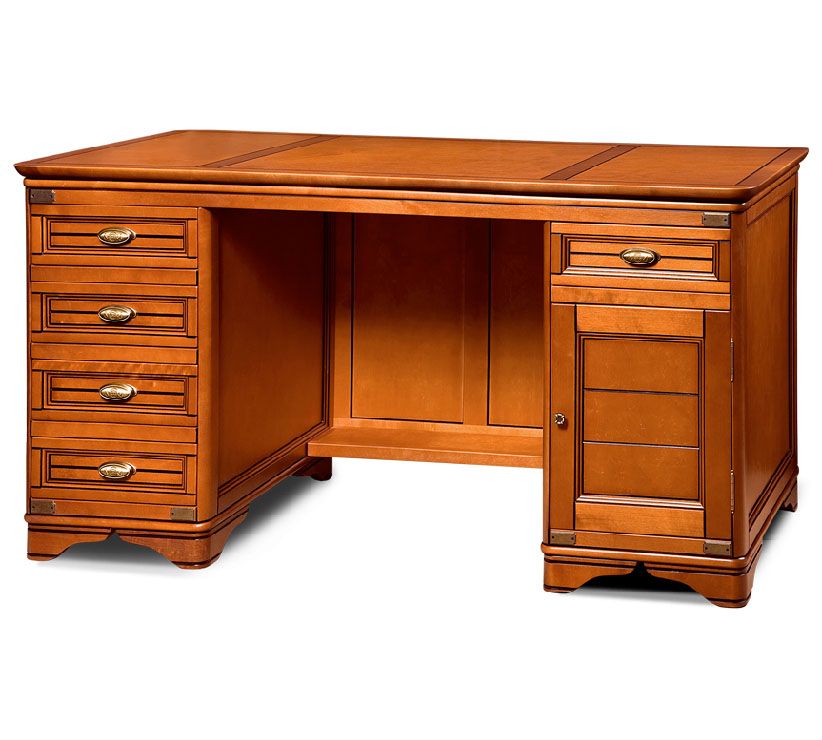 Стол письменный Марина СКМ-001-54 из качественных и экологичных материалов. Слева - тумба с четырьмя ящиками, справа - тумба с дверцей (за ней - полка) и ящиком.