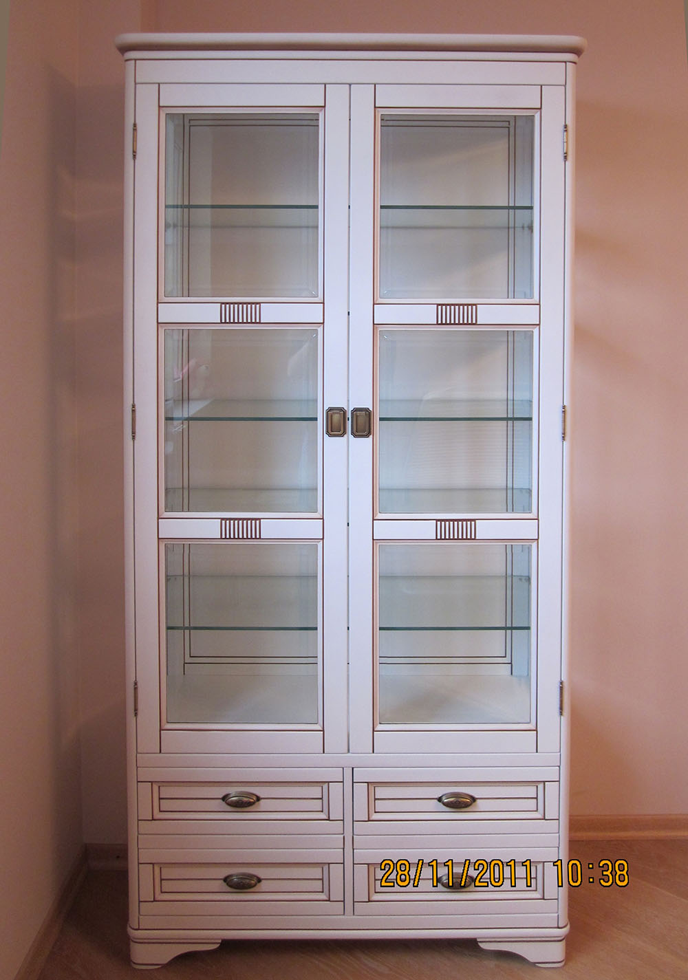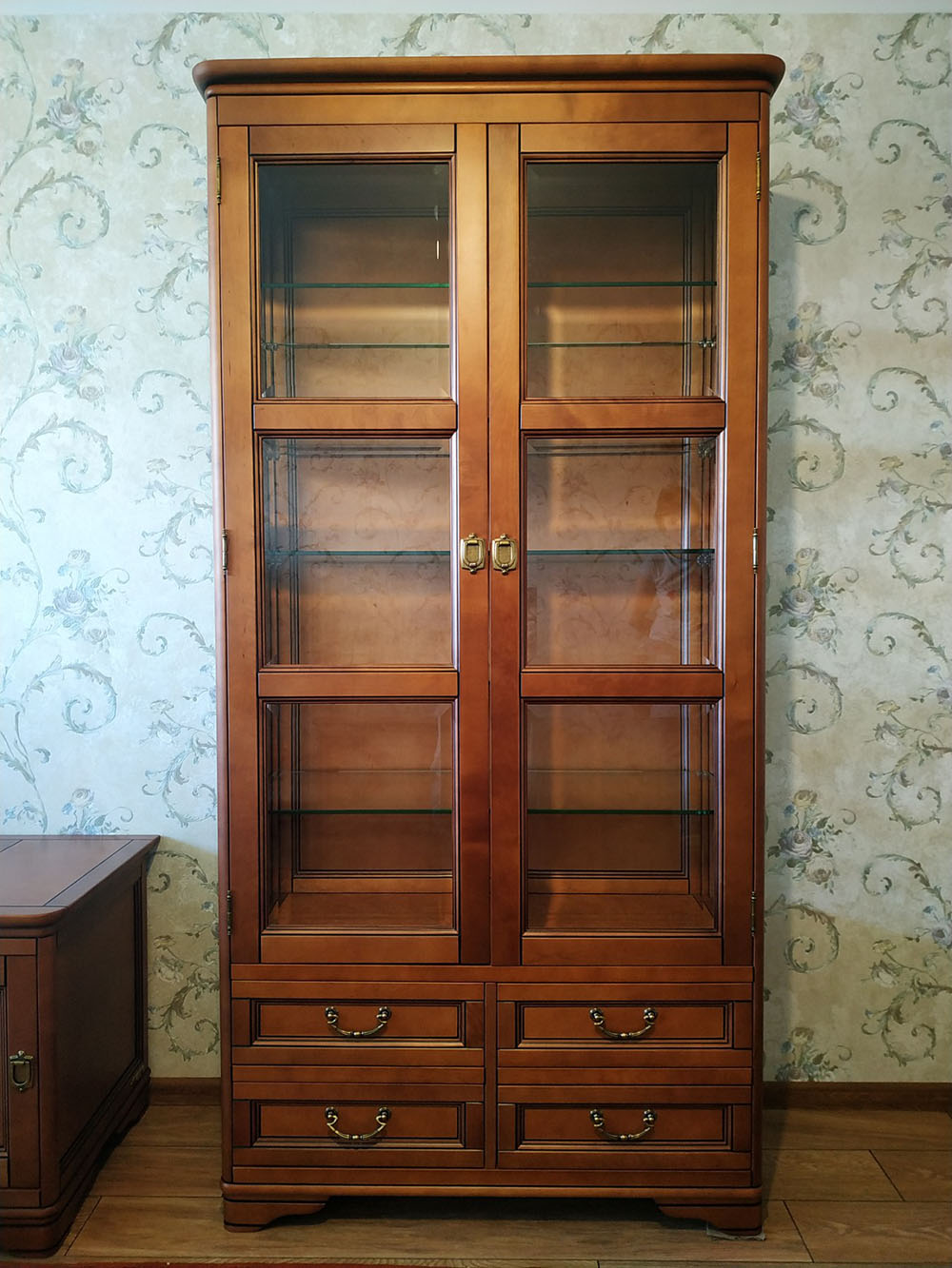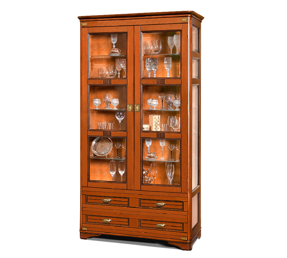 Двойной стеклянный шкаф с витриной Марина СКМ-001-42 из качественных и экологичных материалов с четырьмя выдвижными ящиками в нижней части и двумя распашными дверьми сверху. За дверьми цельные стеклянные полки (пять штук).