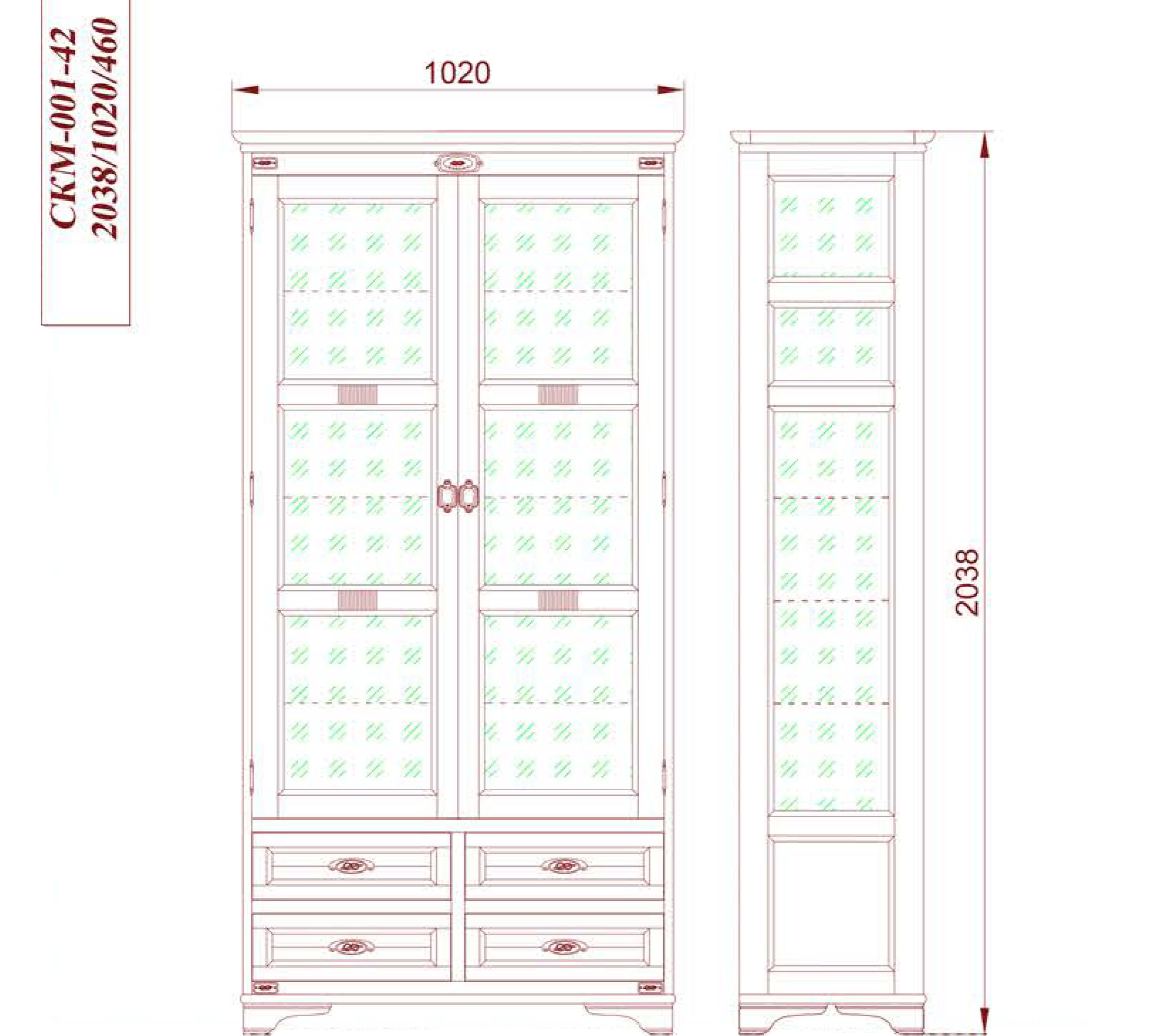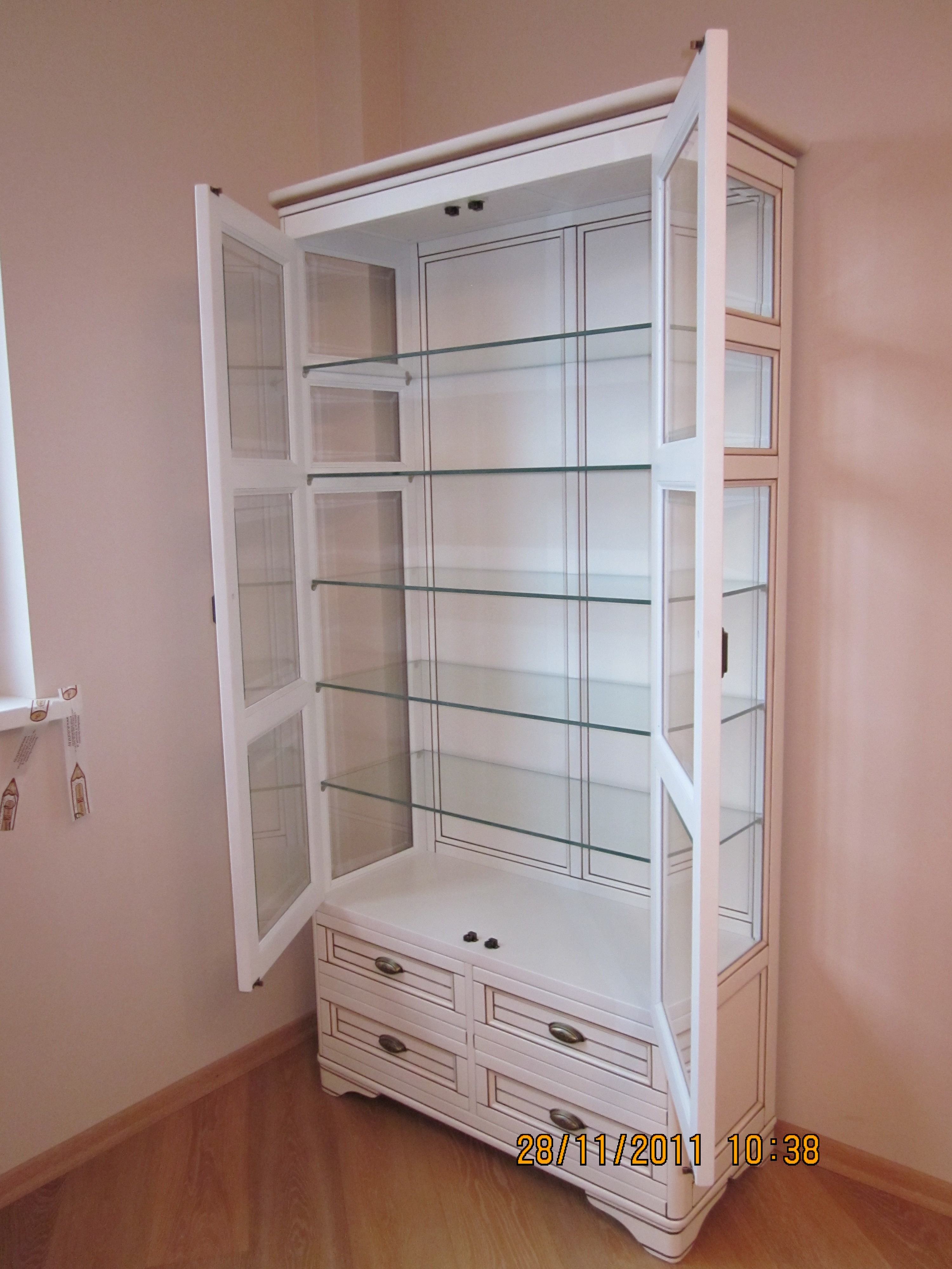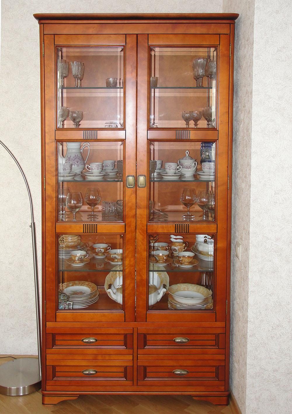 Двойной стеклянный шкаф с витриной Марина СКМ-001-42 из качественных и экологичных материалов с четырьмя выдвижными ящиками в нижней части и двумя распашными дверьми сверху. За дверьми цельные стеклянные полки (пять штук).