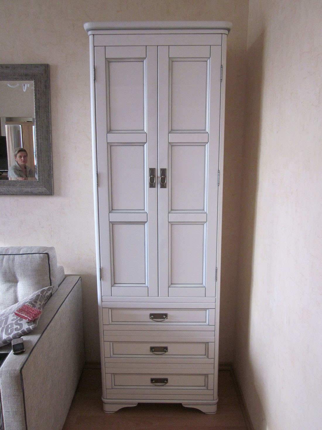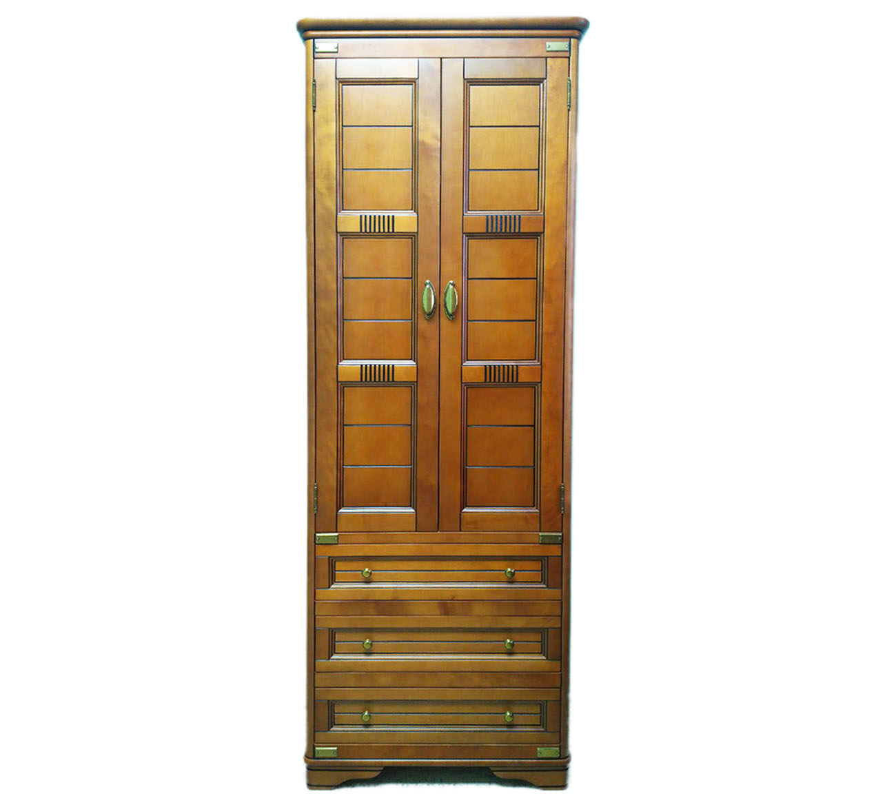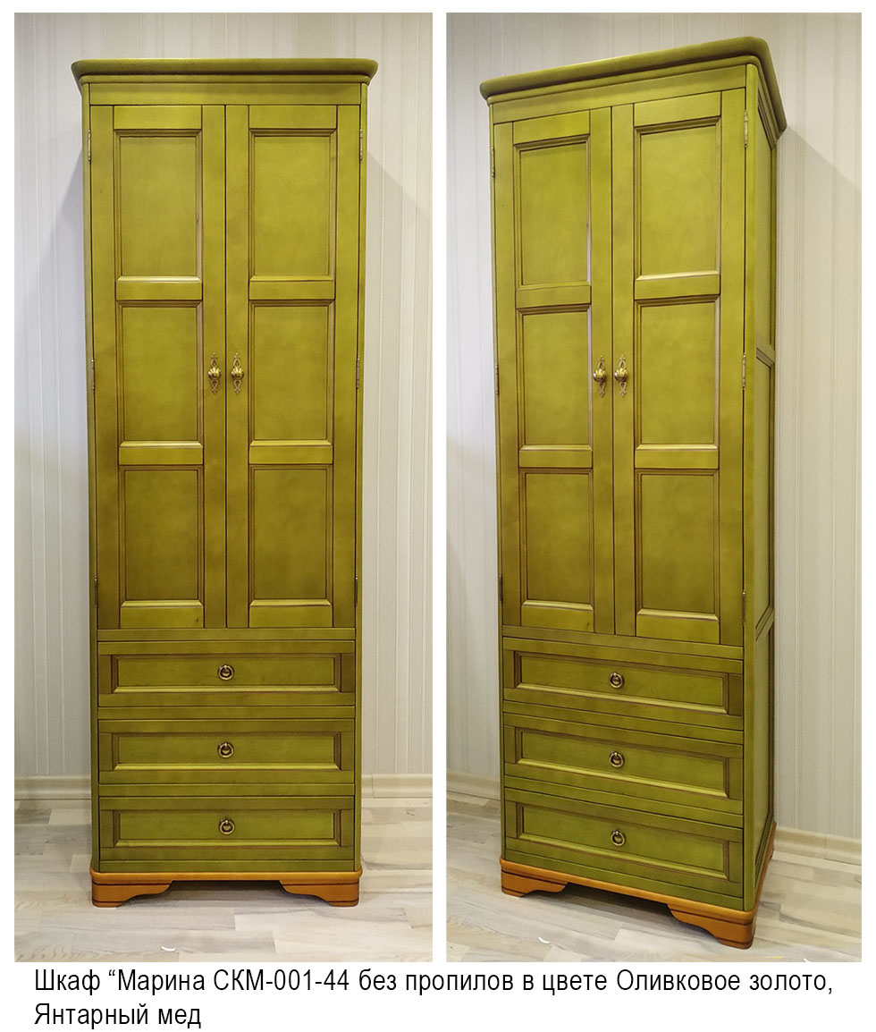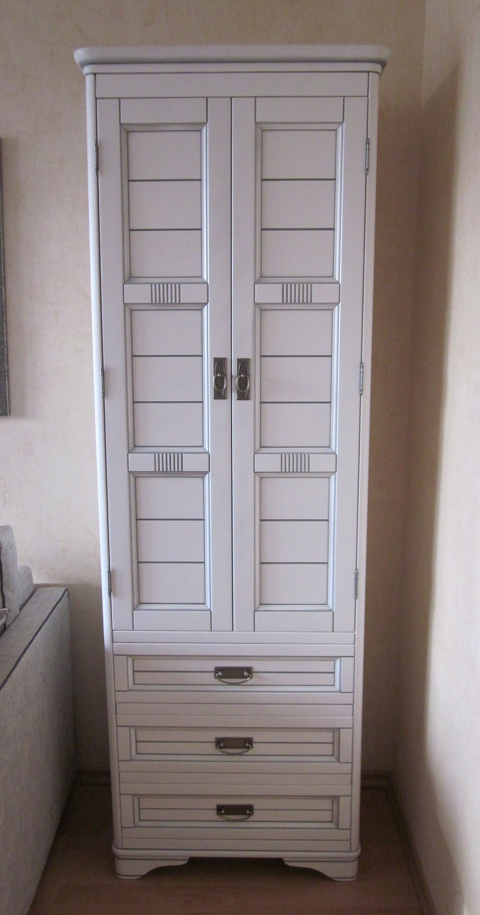 Шкаф для одежды Марина СКМ-001-44 из качественных и экологичных материалов с тремя выдвижными ящиками и распашными дверьми над ними.