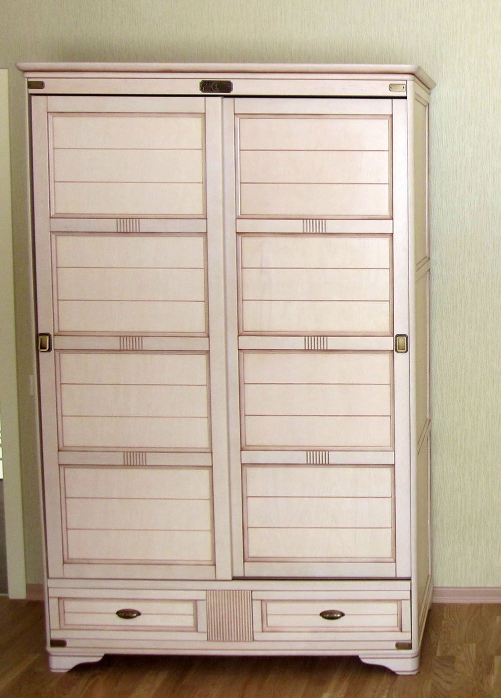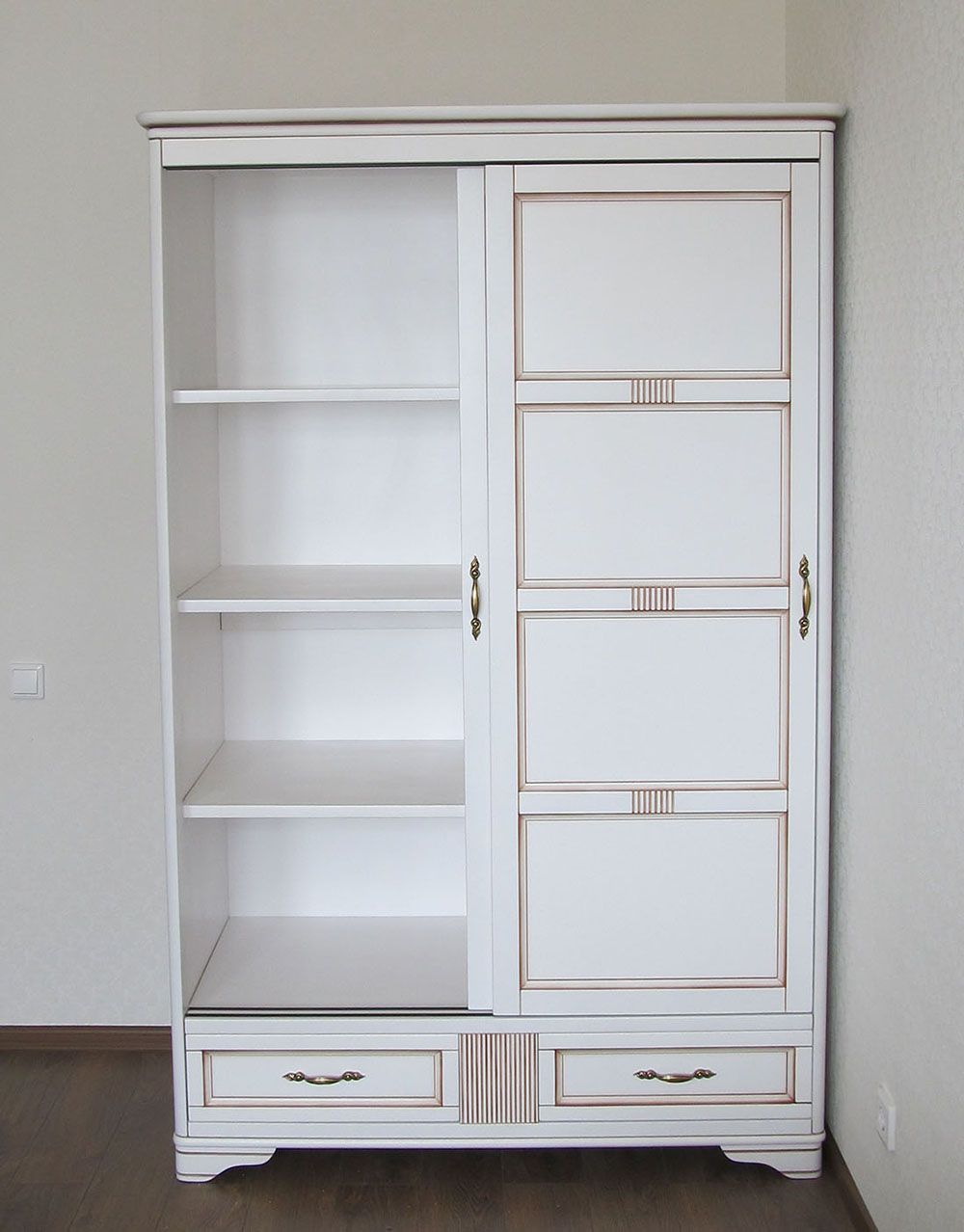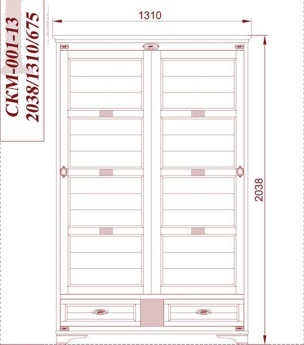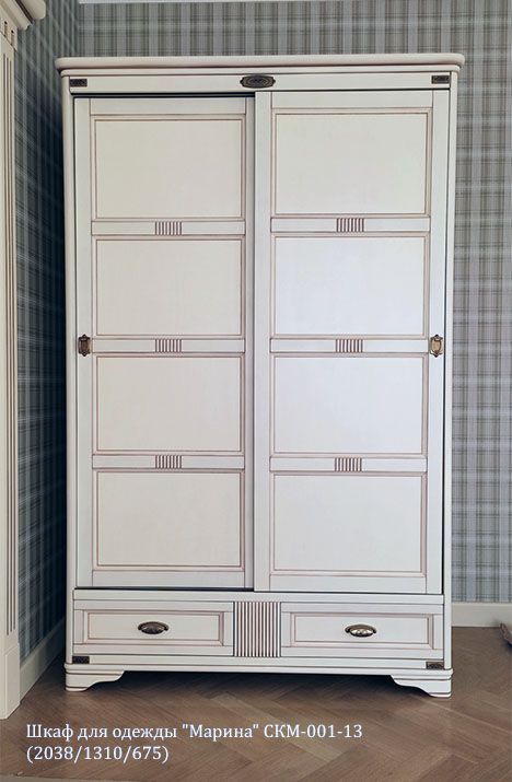Шкаф для одежды Марина СКМ-001-13 из качественных и экологичных материалов с двумя раздвижными дверьми и двумя ящиками. Внутреннее наполнение шкафа может быть любым. В стандартной модели в одной створке - штанга и полка, во второй - три полки.